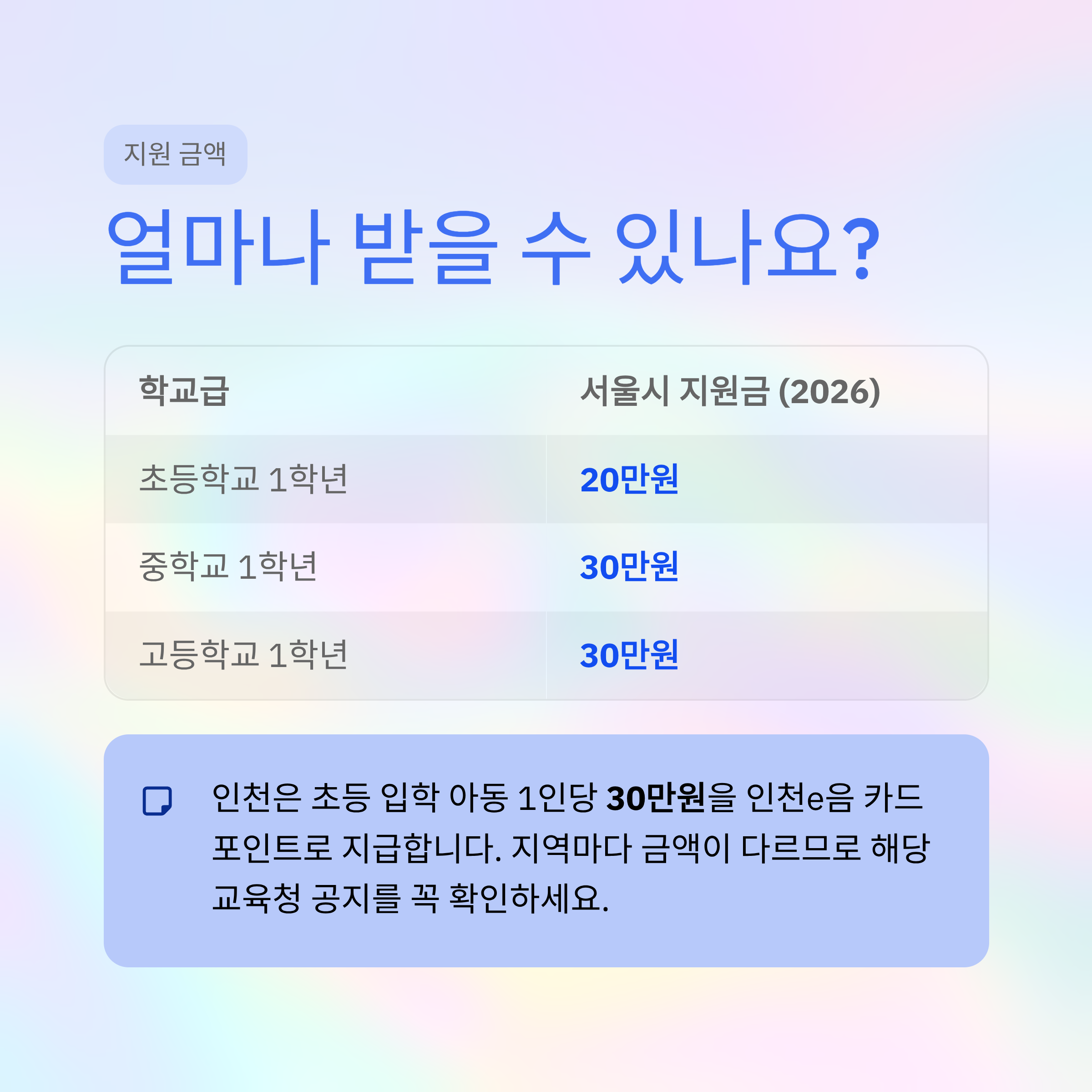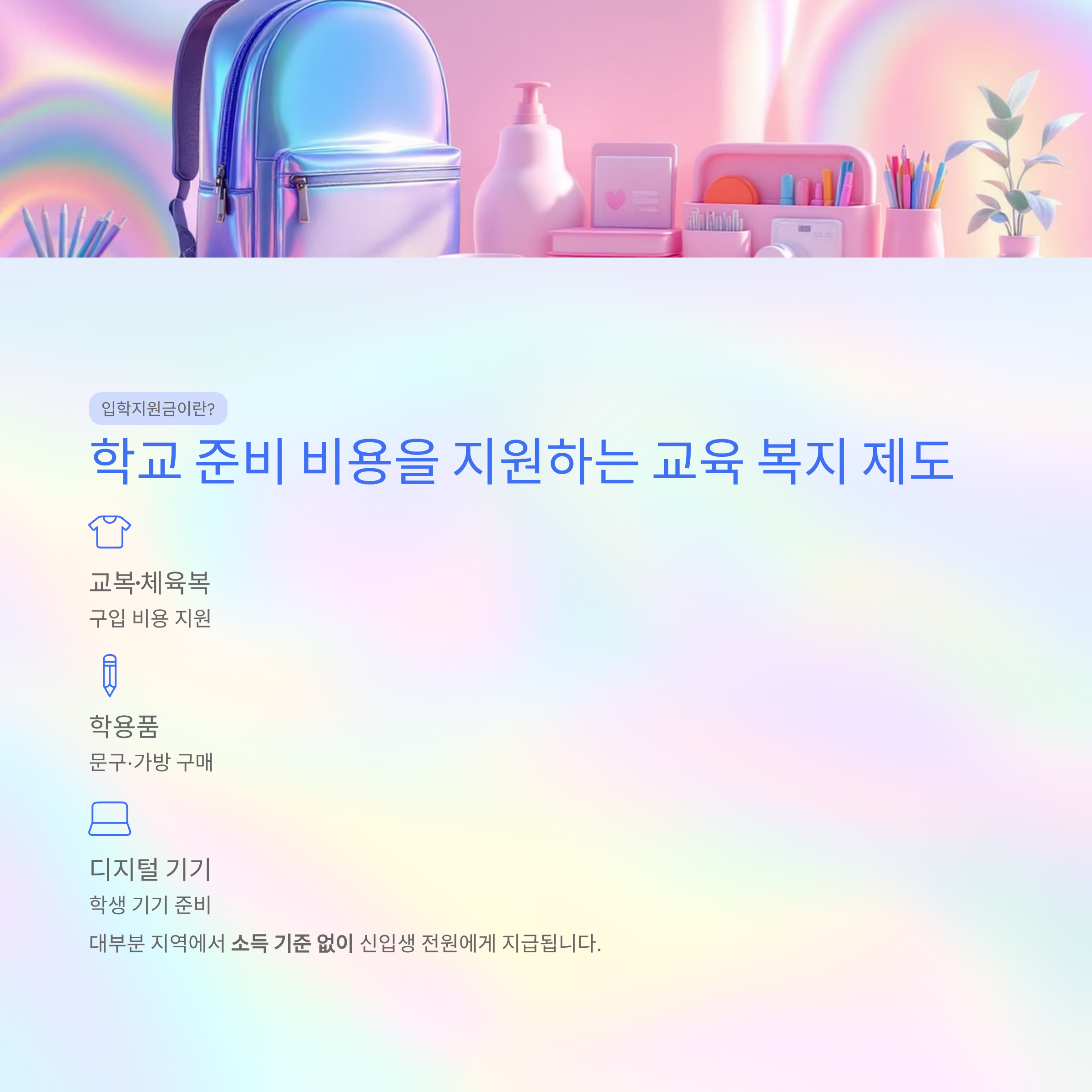 주로 교복, 체육복, 학용품, 가방, 디지털 기기 등 학교생활 준비에 필요한 비용을 지원하며, 지역마다 명칭은 ‘입학준비금’, ‘입학지원금’ 등으로 조금씩 다릅니다.