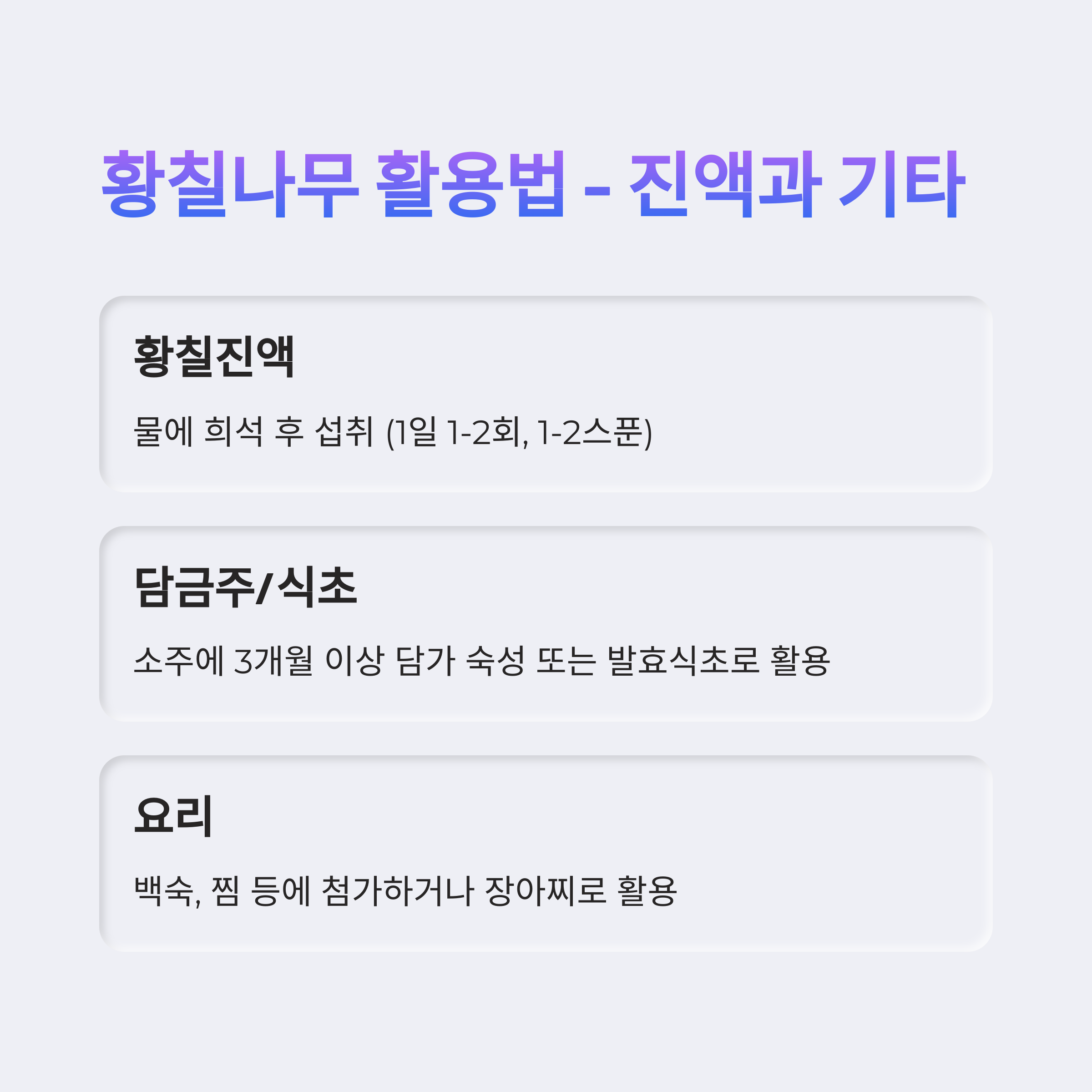 황칠나무는 전통 공예뿐 아니라 건강기능성 식품으로도 활용 가치가 높은 식물입니다. 다만, 체질에 따른 반응과 과잉 섭취 부작용에 유의하여 올바른 섭취법을 따르는 것이 중요합니다.