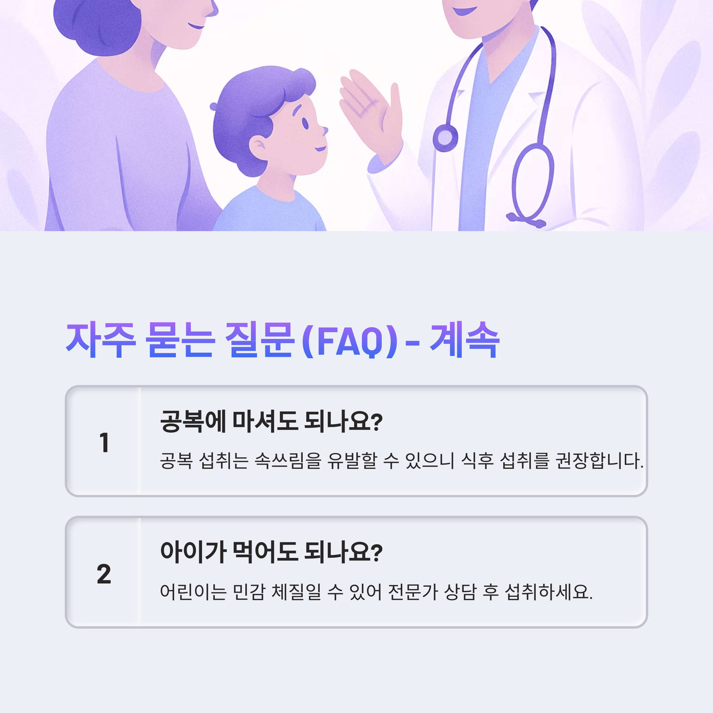 A3. 공복 섭취는 속쓰림을 유발할 수 있으니 식후 섭취를 권장합니다.