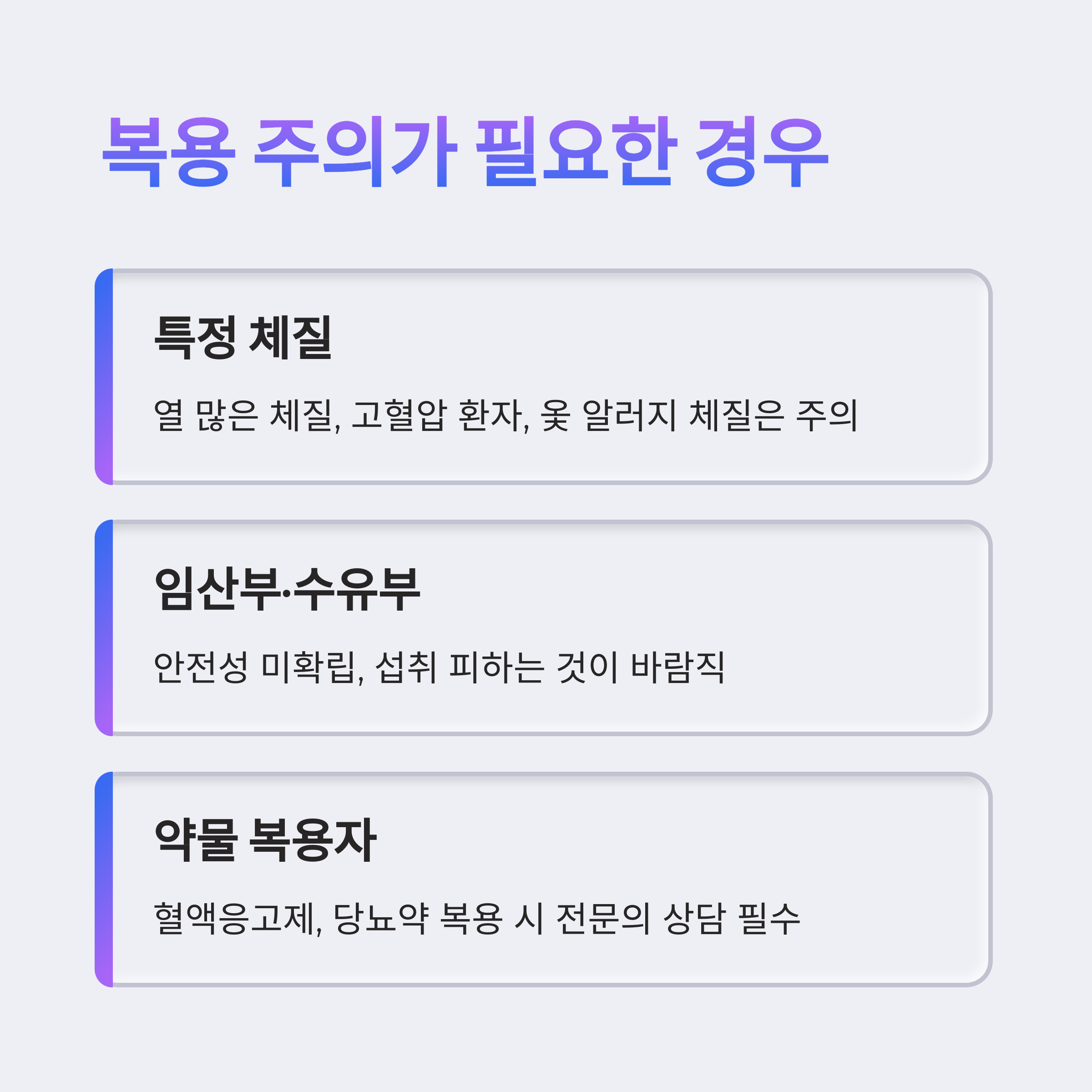 | 임산부·수유부 | 안전성 미확립, 섭취 피하는 것이 바람직 |