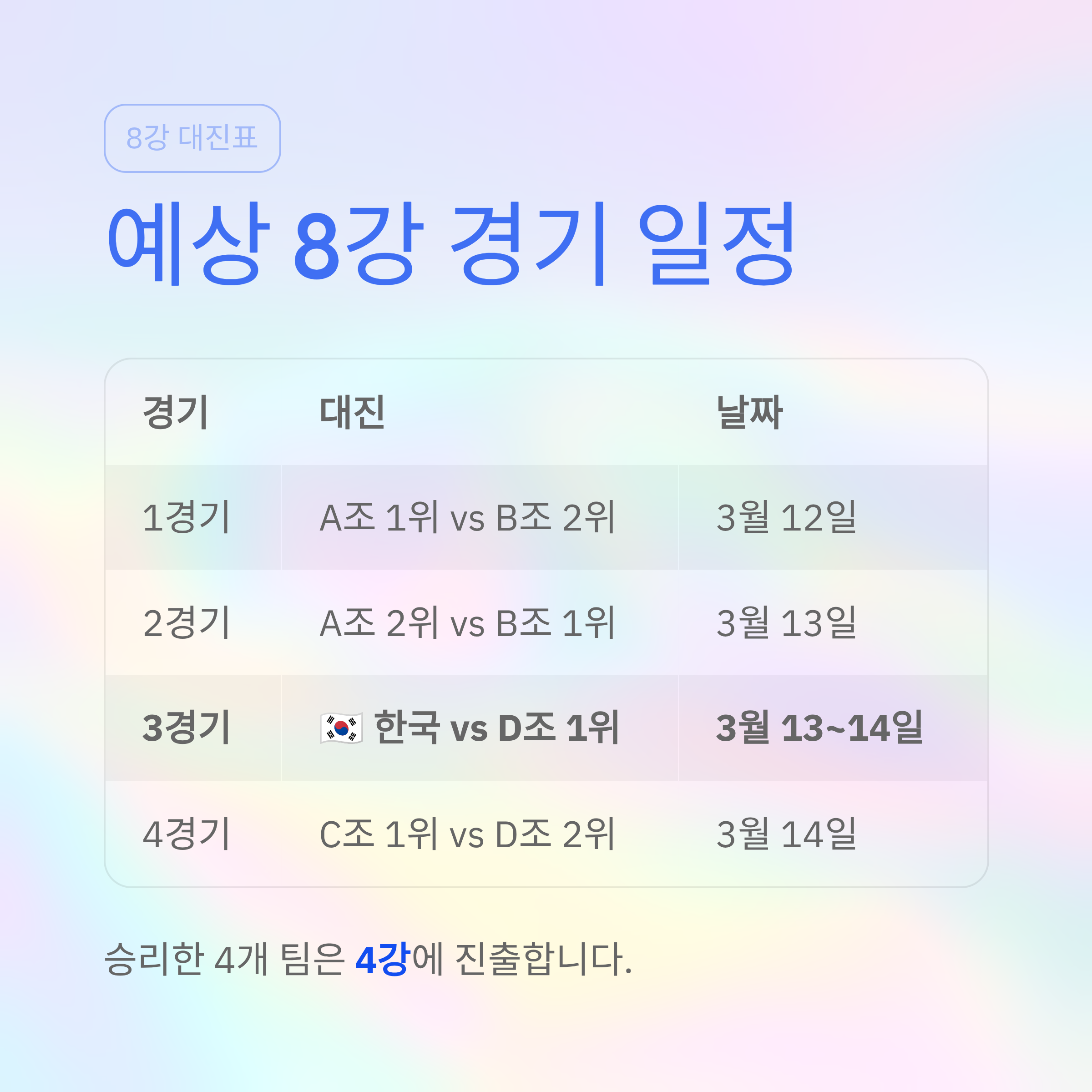 | 8강 3경기 | 한국(C조 2위) vs D조 1위 | 3월 13일 또는 14일 |