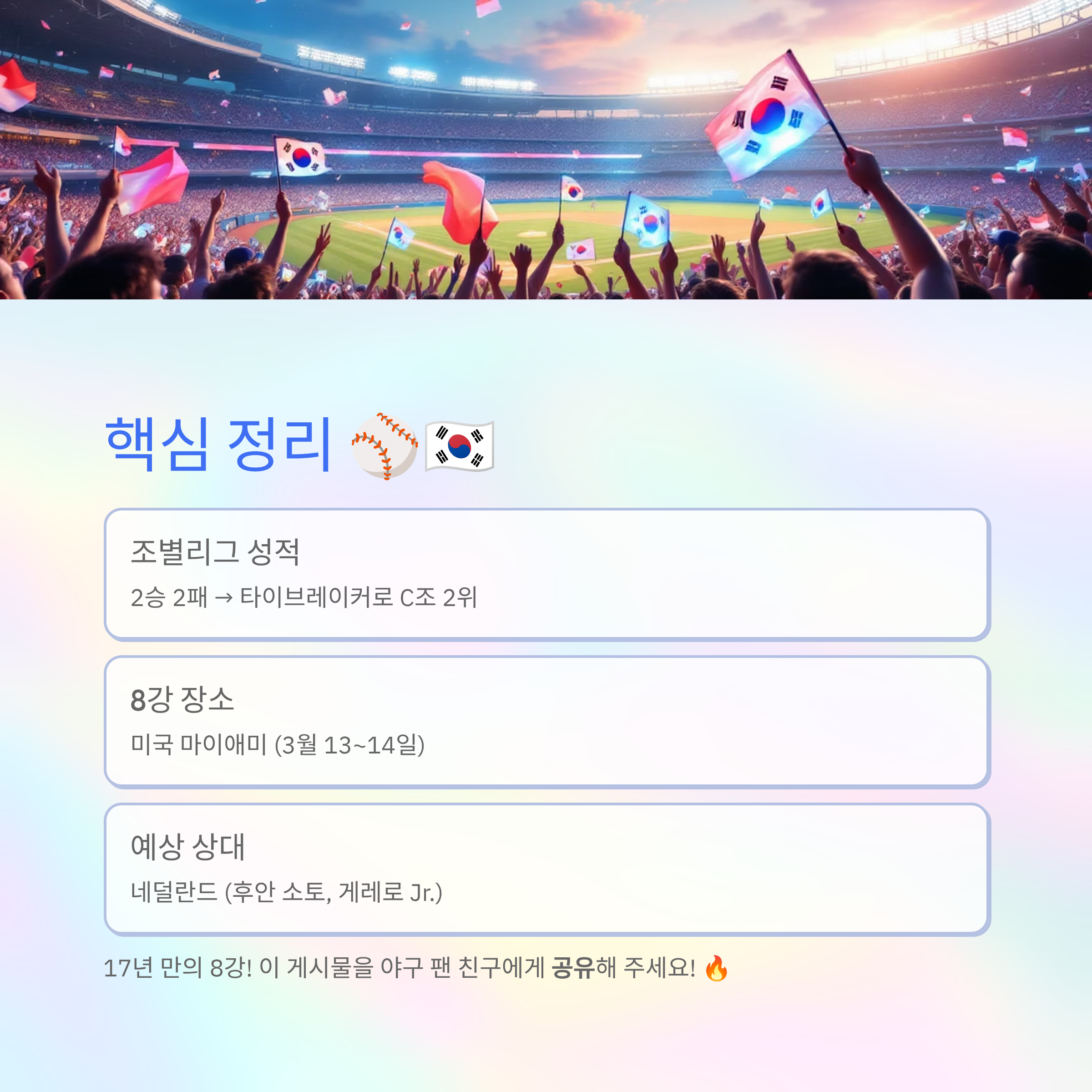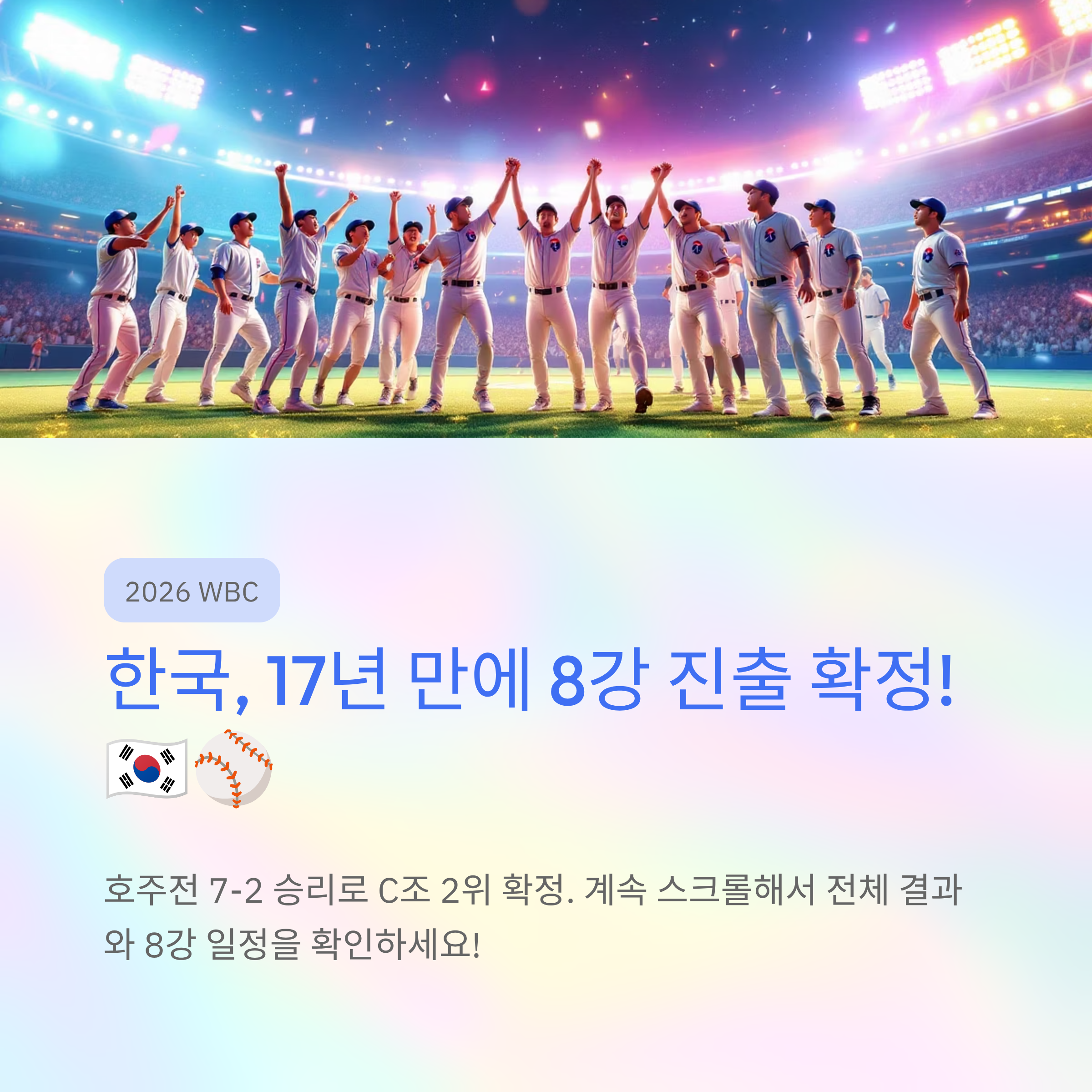2026 WBC에서 한국 대표팀은 조별리그 마지막 경기 승리로 17년 만에 8강 진출에 성공했습니다.