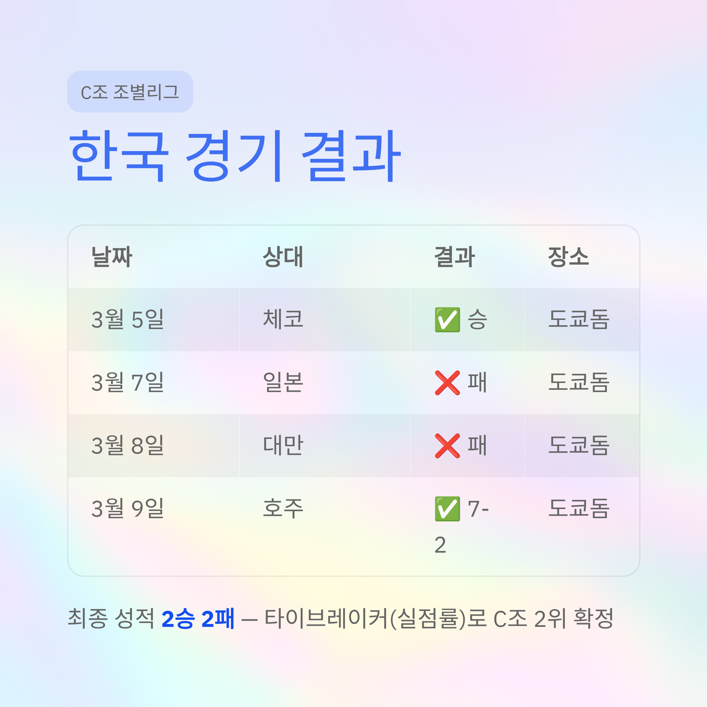 한국은 일본 도쿄돔에서 열린 C조 조별리그에서 다음과 같은 성적을 기록했습니다.