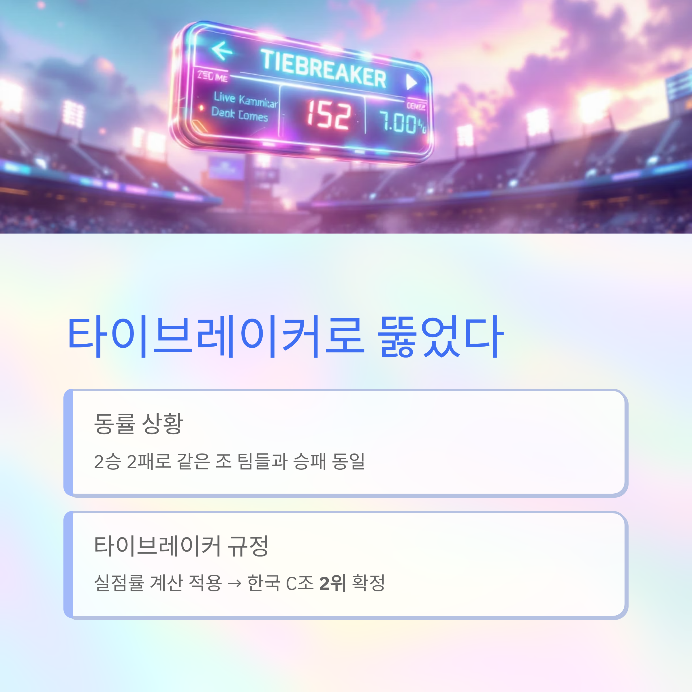 같은 조 팀들과 승패가 동일했지만 타이브레이커(실점률) 규정에 따라 한국이 조 2위로 올라가게 됐습니다.