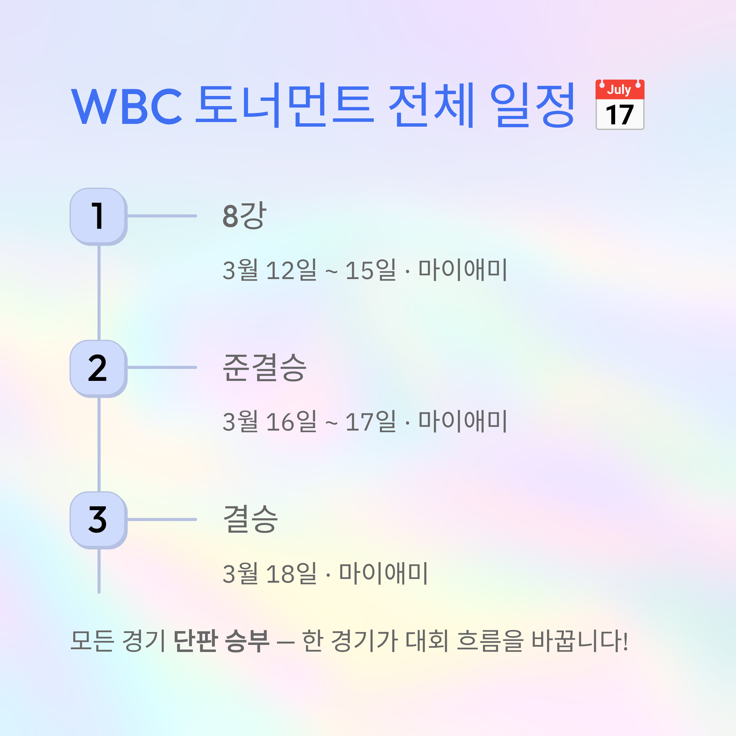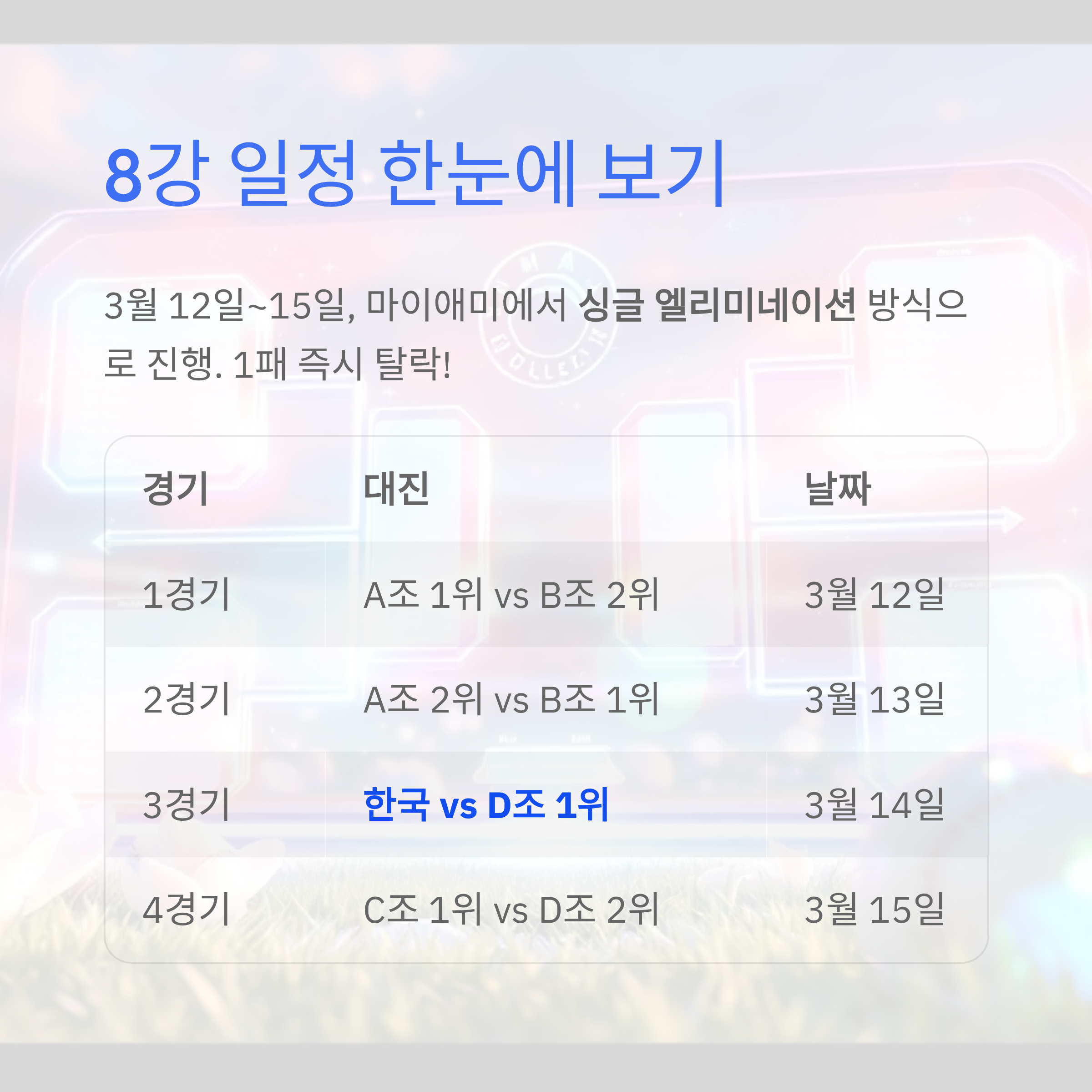 이번 WBC 8강은 미국 마이애미에서 단판 승부 방식으로 진행되며, 각 조 상위 팀들이 맞붙어 4강 진출을 결정하게 됩니다.