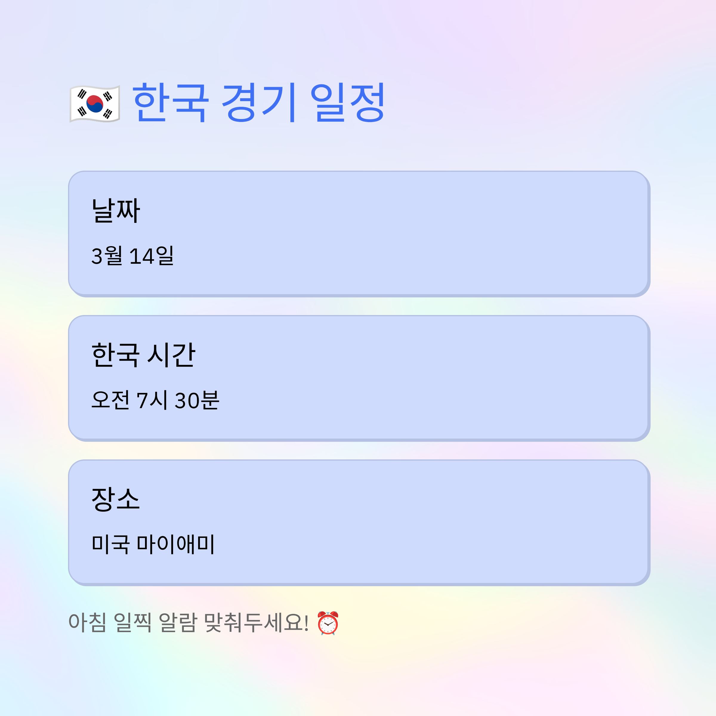 특히 한국 대표팀이 출전하는 경기는 **3월 14일 오전 7시 30분(한국시간)**에 열릴 예정입니다.