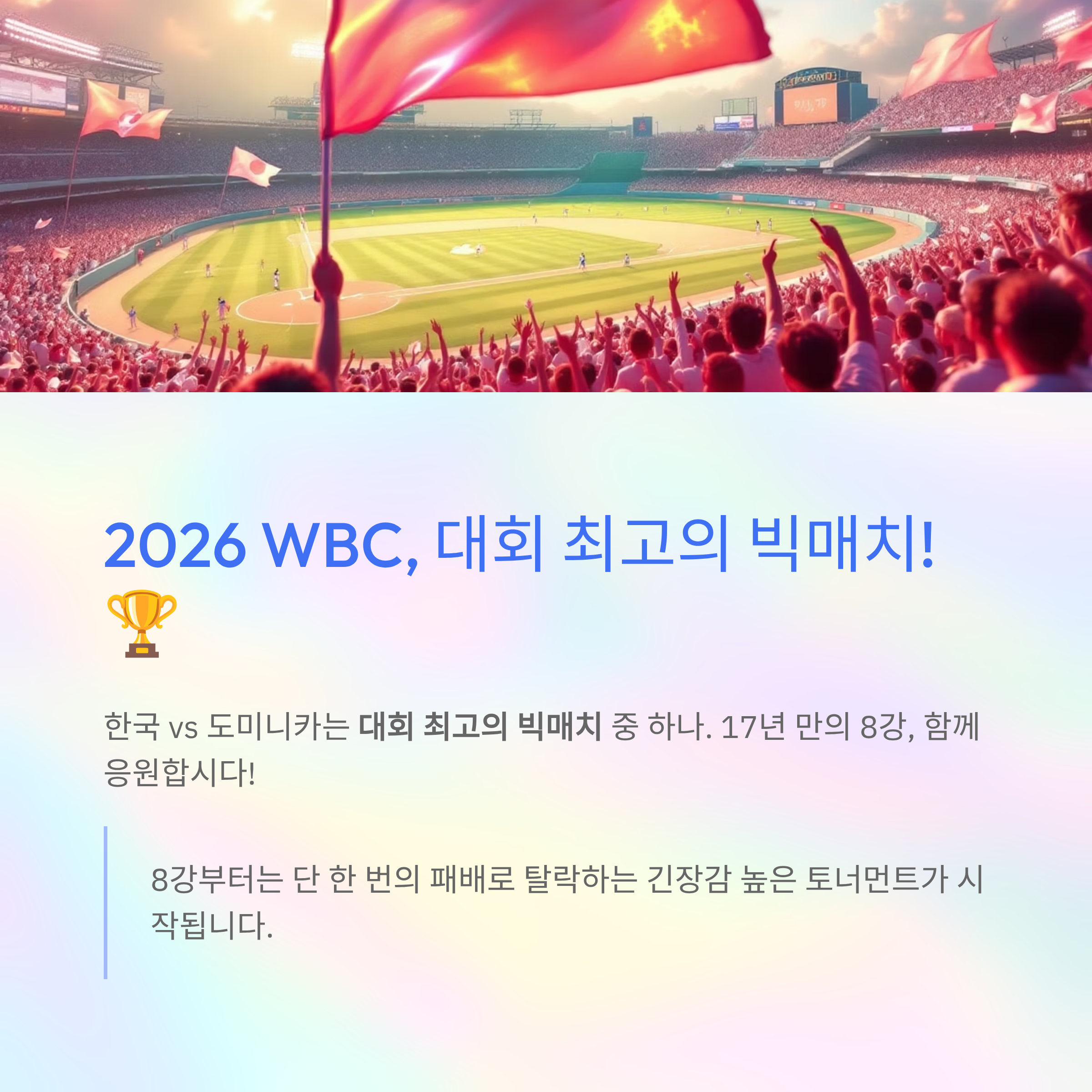 2026년 "월드베이스볼클래식(WBC)"이 조별리그를 마치고 본격적인 토너먼트 단계에 들어가면서 야구 팬들의 관심이 8강전에 집중되고 있습니다. 특히 한국 대표팀이 17년 만에 8강 진출에 성공하면서 경기 일정과 상대 팀에 대한 관심이 크게 높아졌습니다.