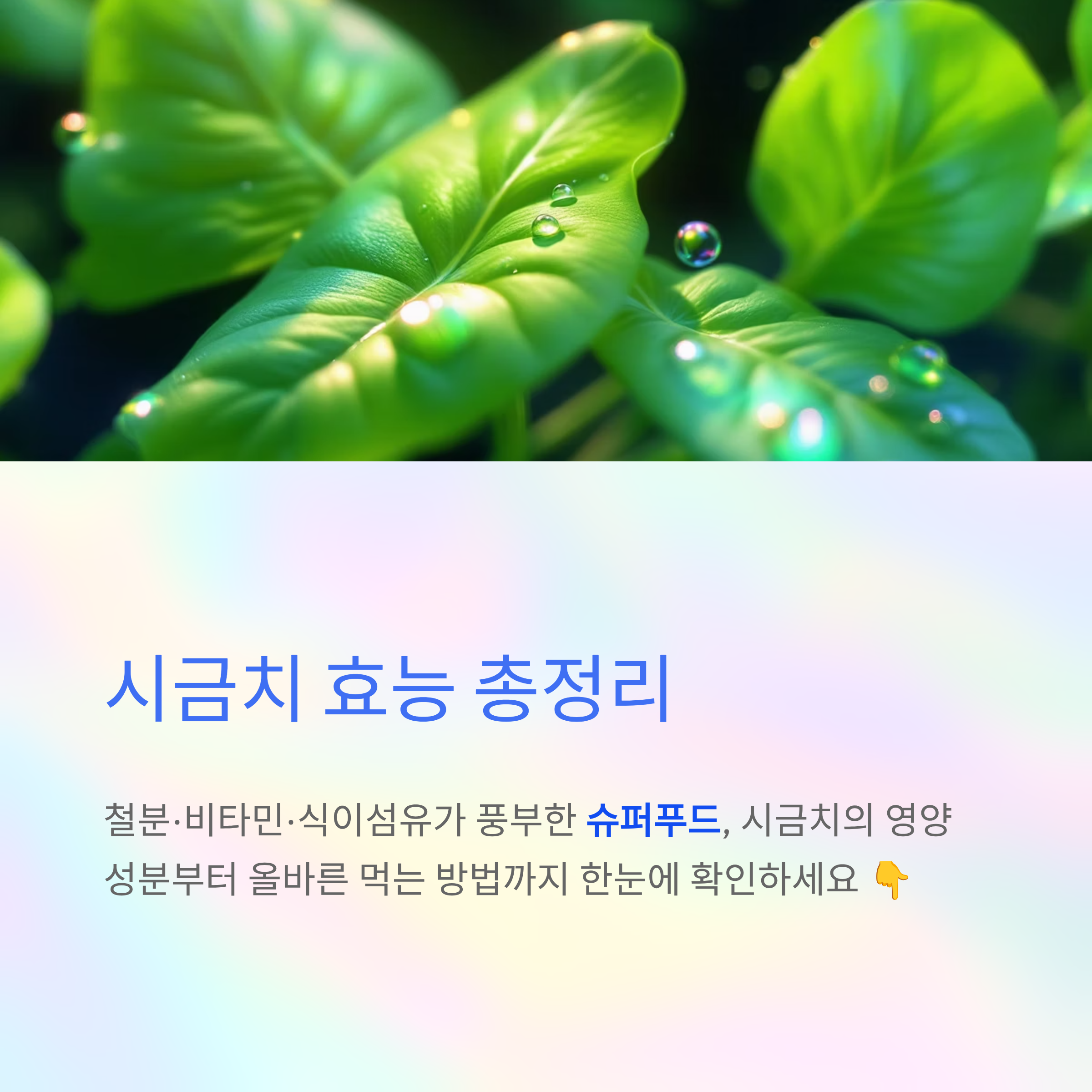 시금치는 철분, 비타민, 식이섬유가 풍부한 대표 건강 채소로 빈혈 예방, 눈 건강, 면역력 강화 등 다양한 건강 효과가 있습니다.