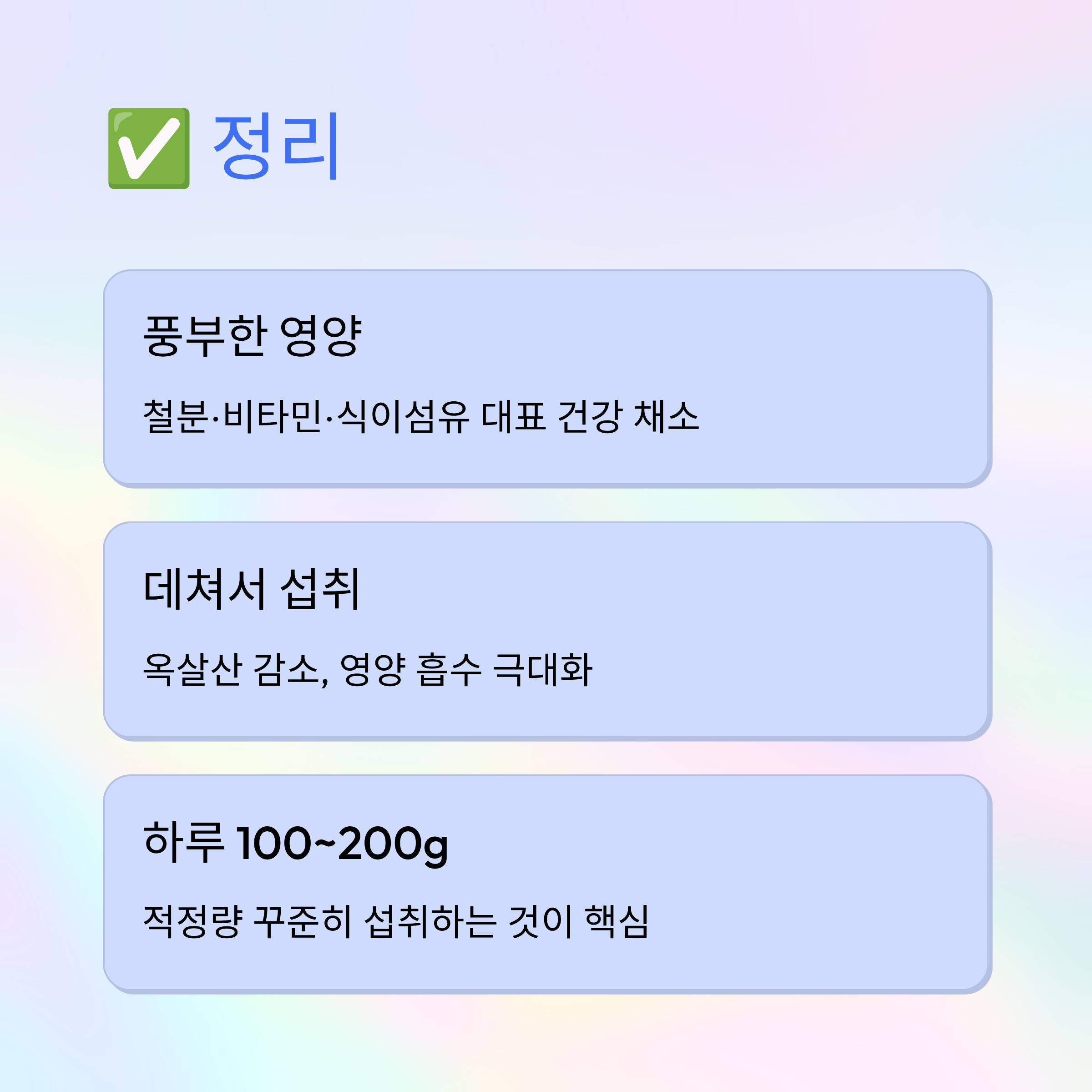 다만 옥살산 성분 때문에 데쳐서 섭취하는 것이 가장 좋으며 하루 100~200g 정도가 적당한 섭취량입니다.
