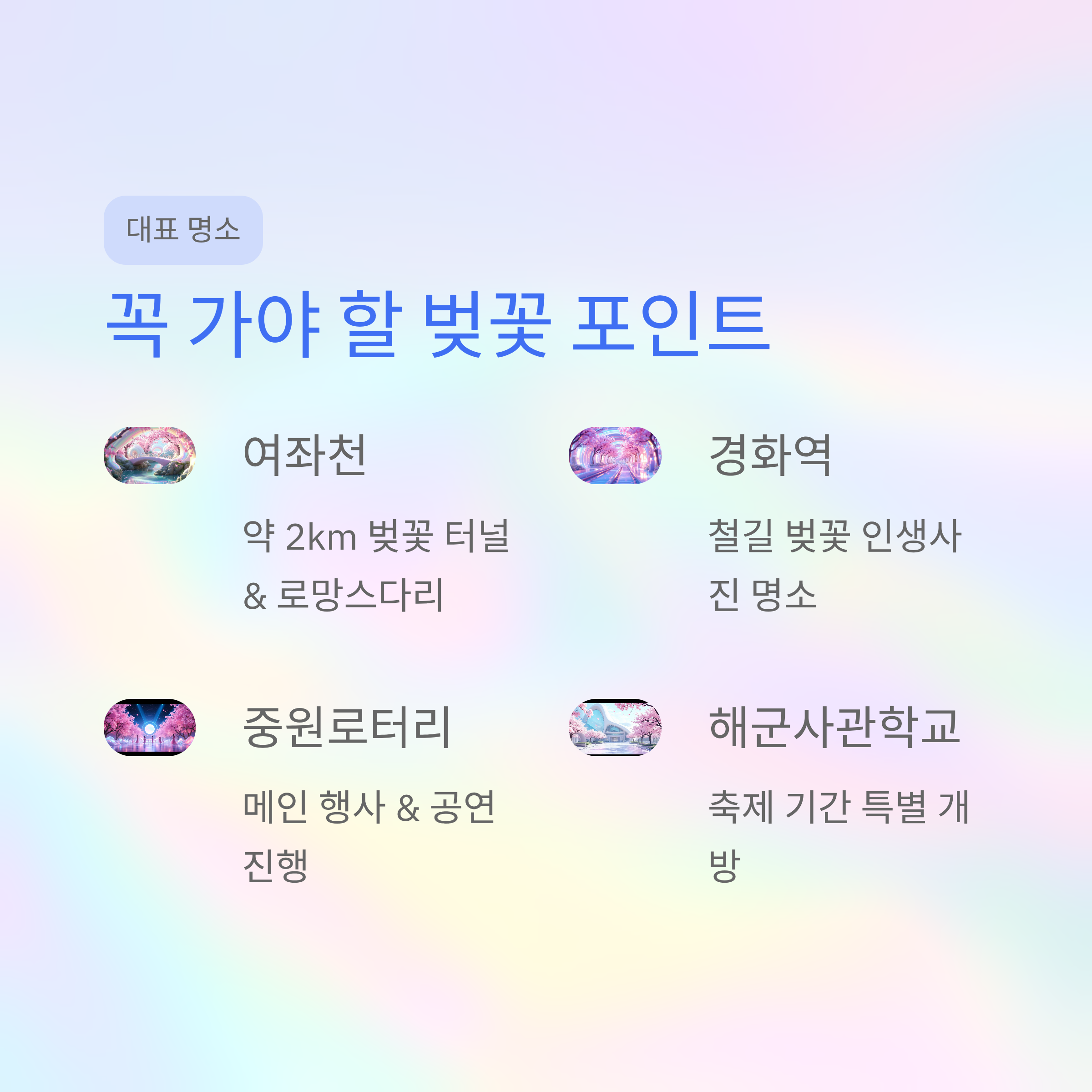 - 주요 장소: 중원로터리, 여좌천, 경화역, 해군사관학교