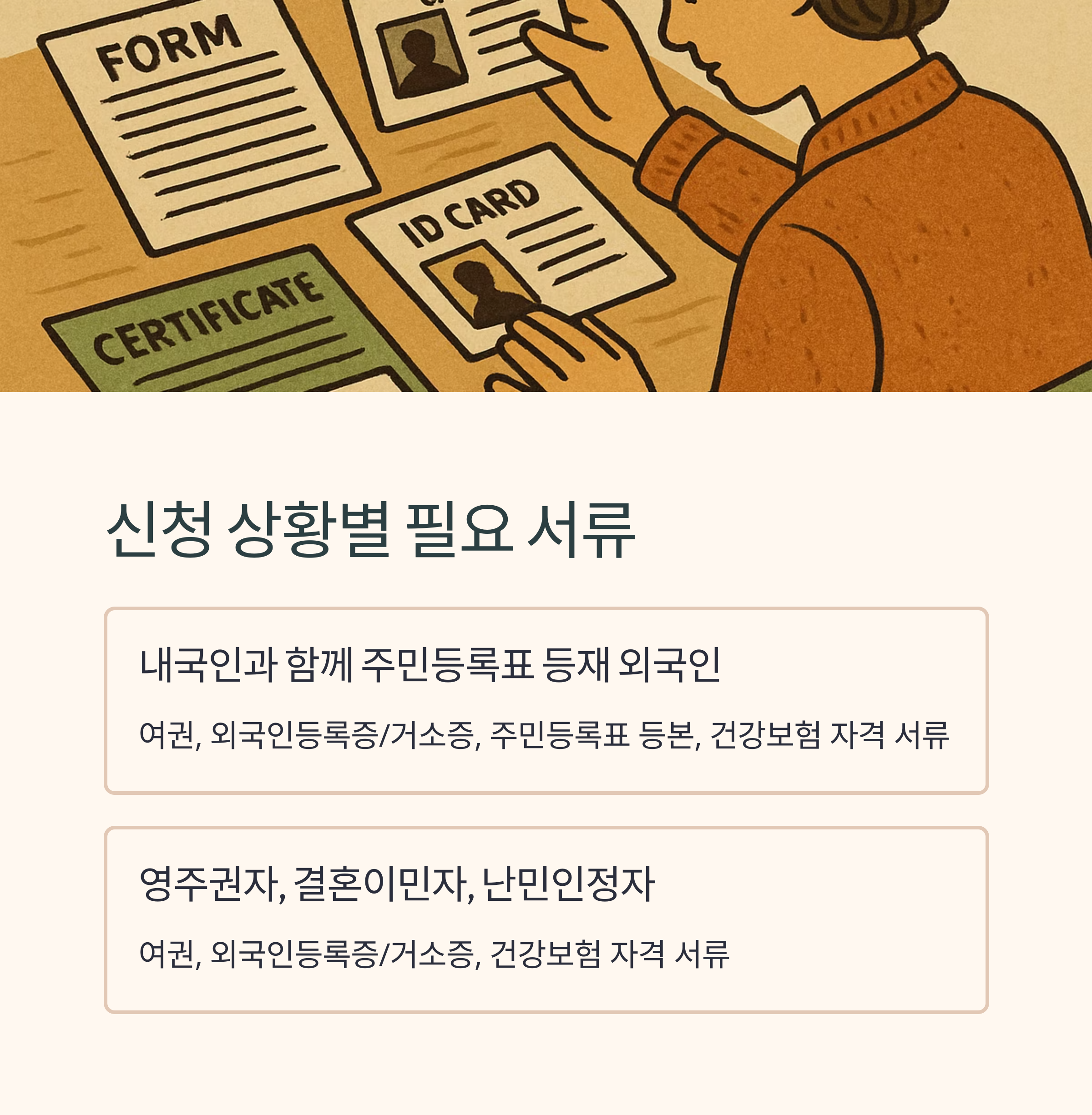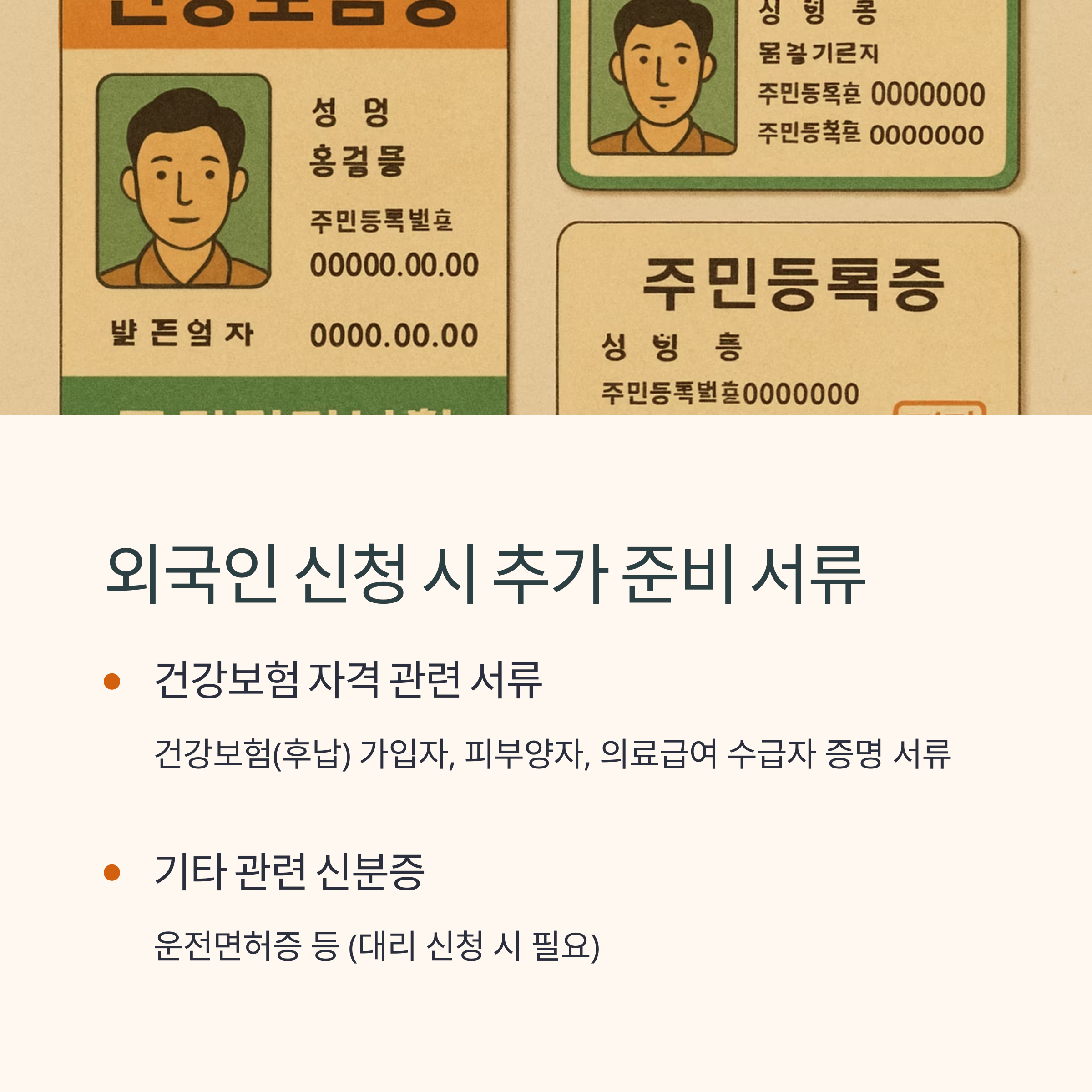 | 내국인과 함께 주민등록표 등재 외국인 | 여권, 외국인등록증/거소증, 주민등록표 등본, 건강보험 자격 서류 |