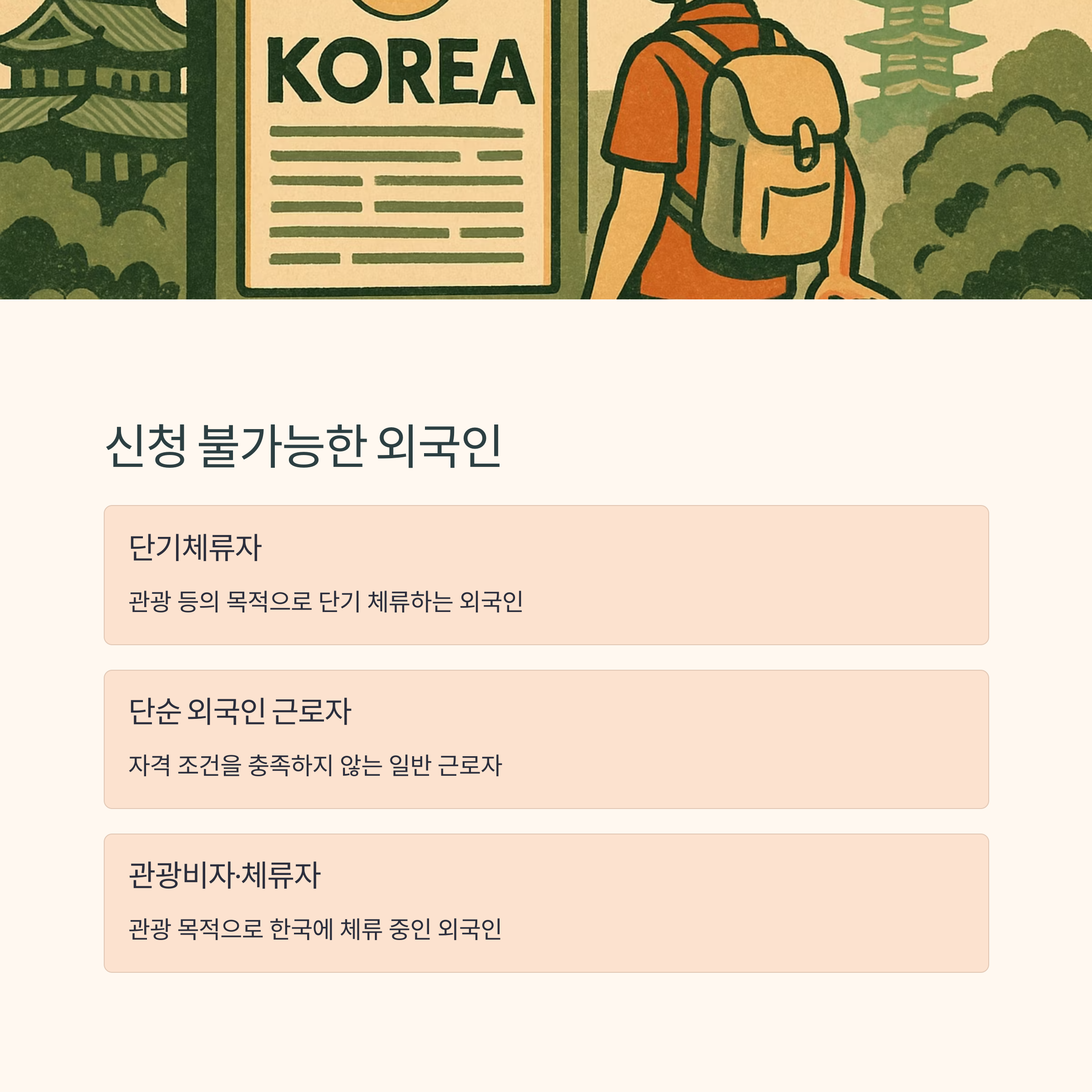 - 위 조건을 모두 충족하지 않는 일반 외국인은 원칙적으로 지원에서 제외됩니다.