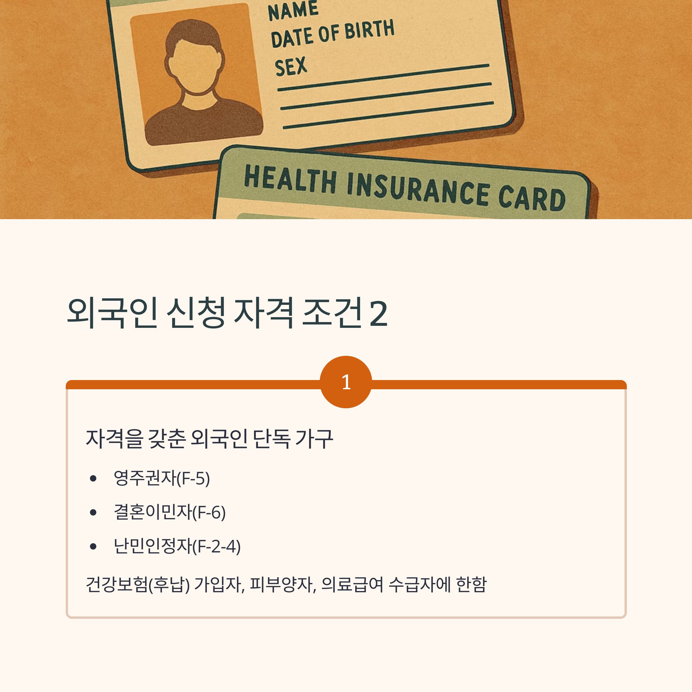 | 결혼이민자(F-6) | 가능 | 건강보험(후납)/피부양자/의료급여자 |