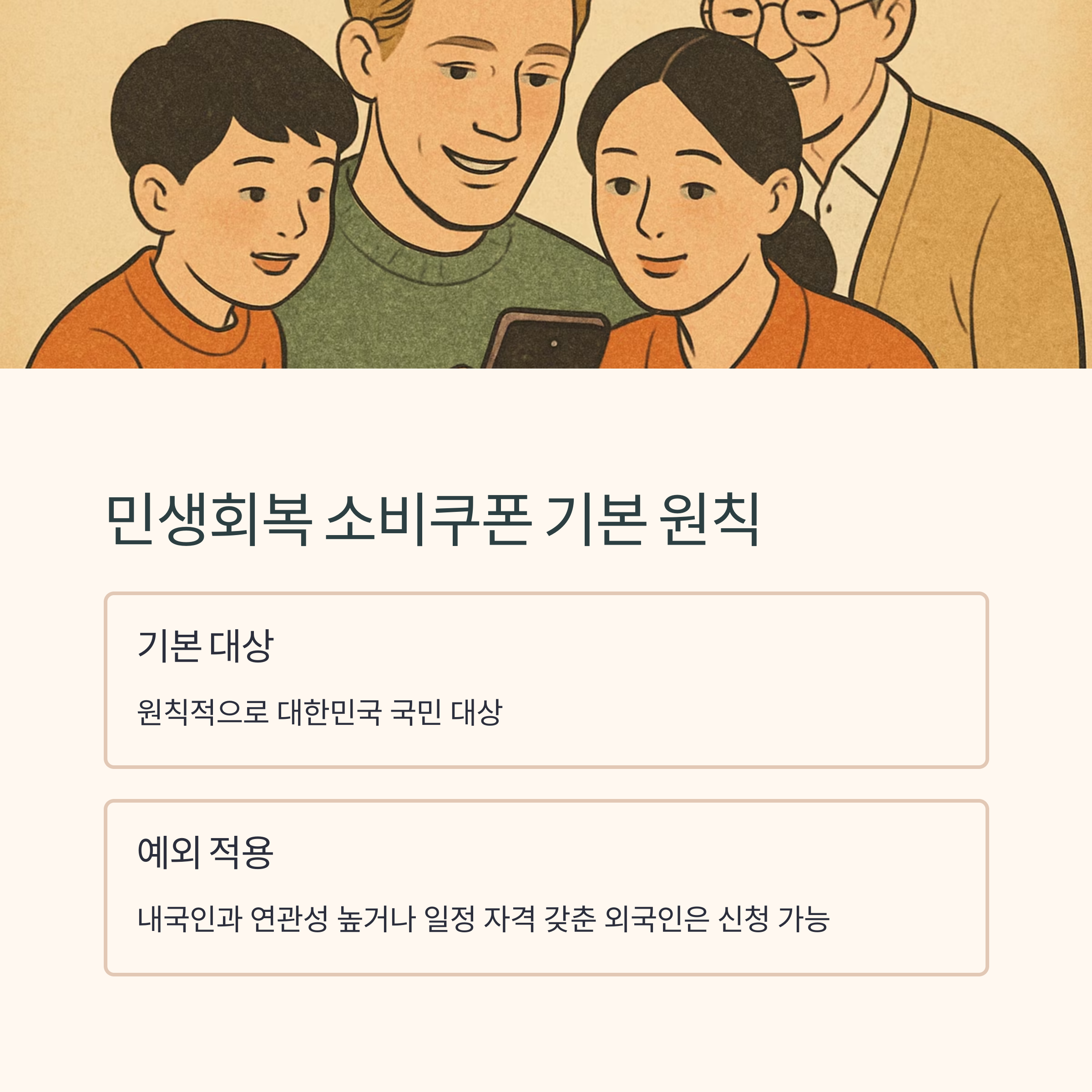 - 민생회복 소비쿠폰은 지역경제 활성화 및 국민 소득 지원을 위한 취지로, 원칙적으로 대한민국 국민을 대상으로 합니다.