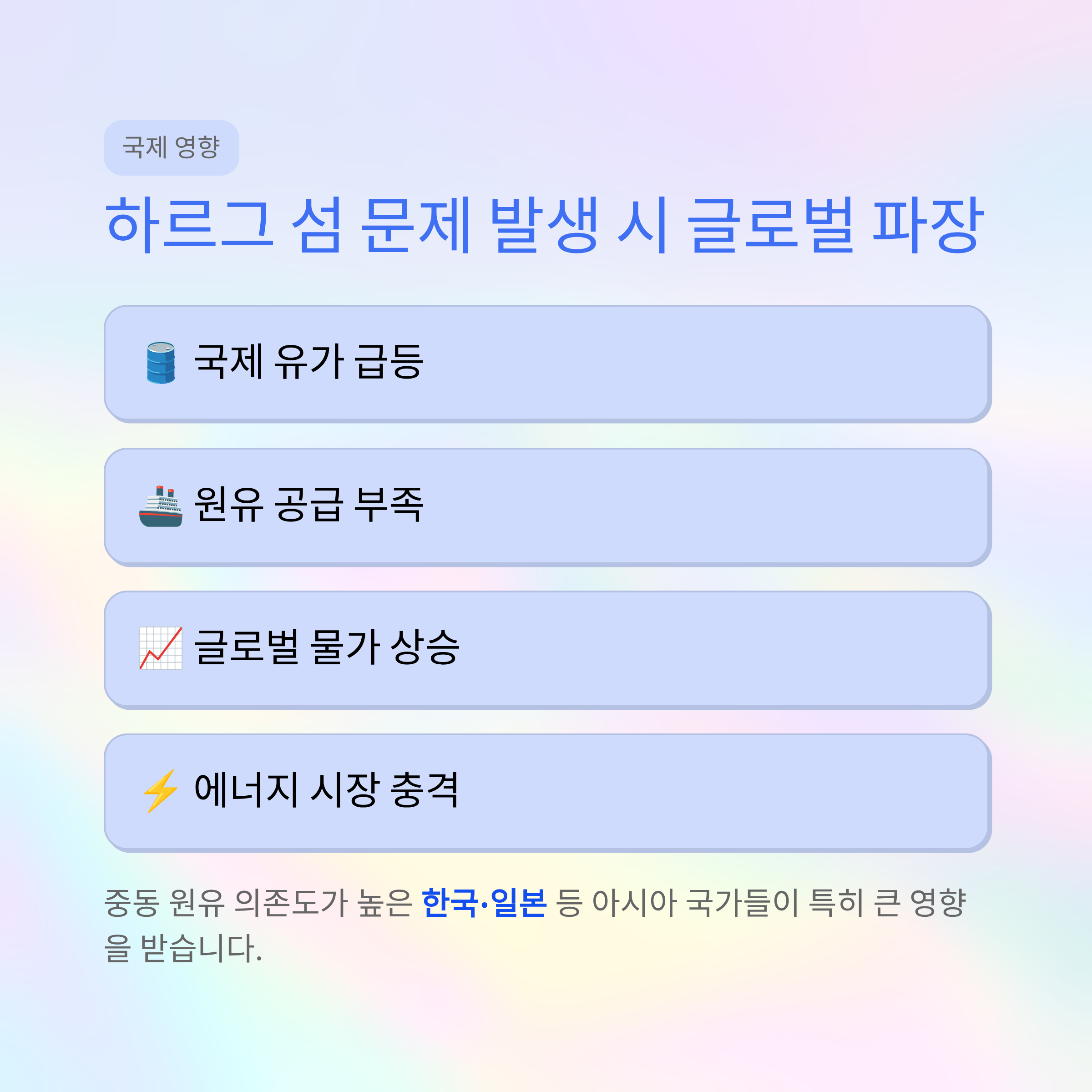 특히 중동 원유 의존도가 높은 한국과 일본 같은 아시아 국가들이 영향을 크게 받습니다.