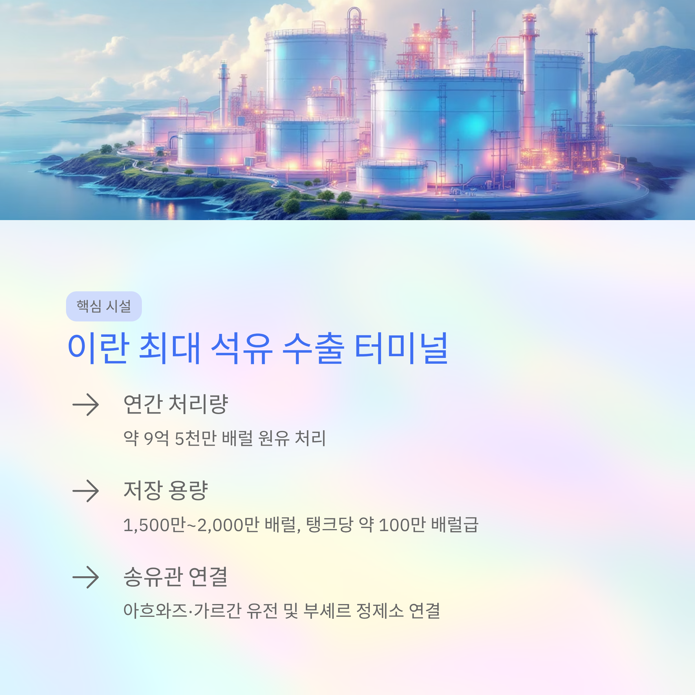 - 전쟁 이후 재건되어 현재 이란 최대 원유 수출 기지로 성장