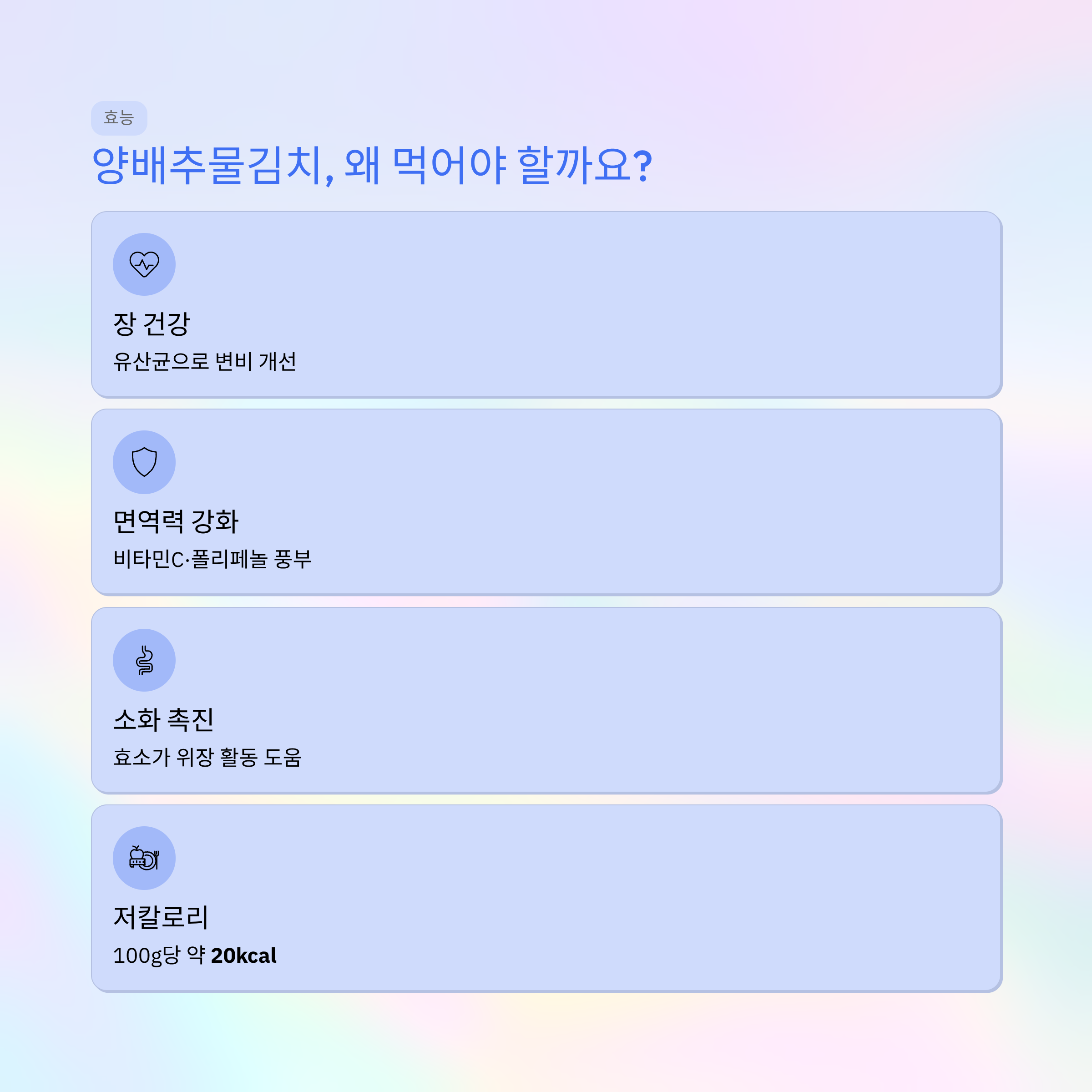 양배추의 식이섬유와 발효 과정에서 생기는 유산균이 장내 유익균을 늘려 변비 개선과 장 건강에 도움을 줍니다.