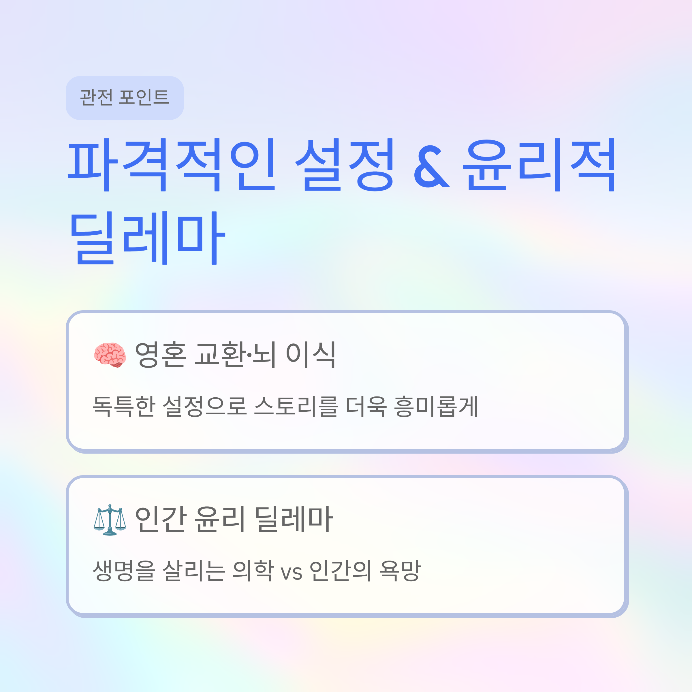영혼 교환과 뇌 이식이라는 독특한 설정이 스토리를 더욱 흥미롭게 만듭니다.