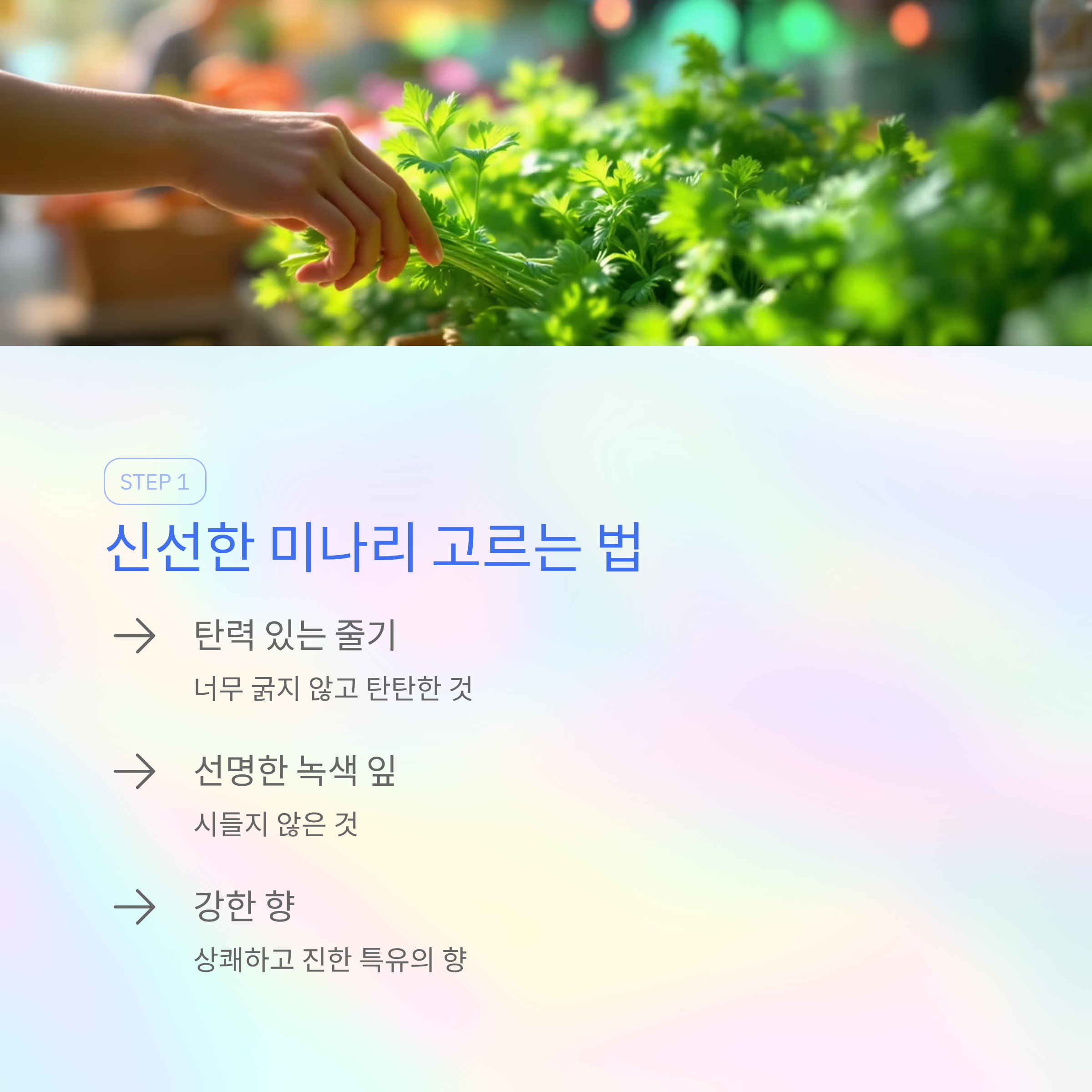 - 미나리는 데치지 않고 생으로 무치는 것이 향이 가장 좋습니다.