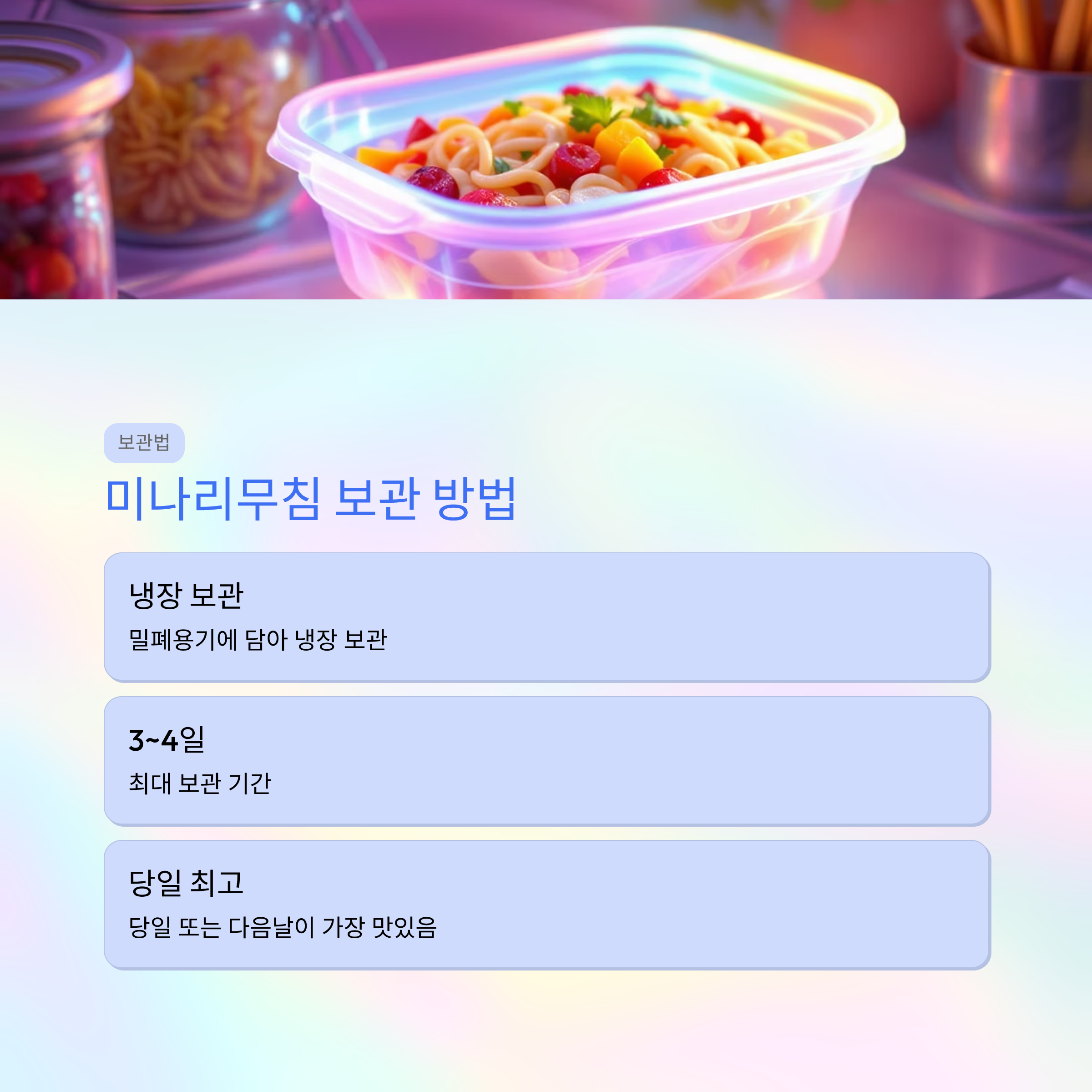 미나리무침은 생채 스타일이라 오래 보관하기보다는 빠르게 먹는 것이 좋습니다.