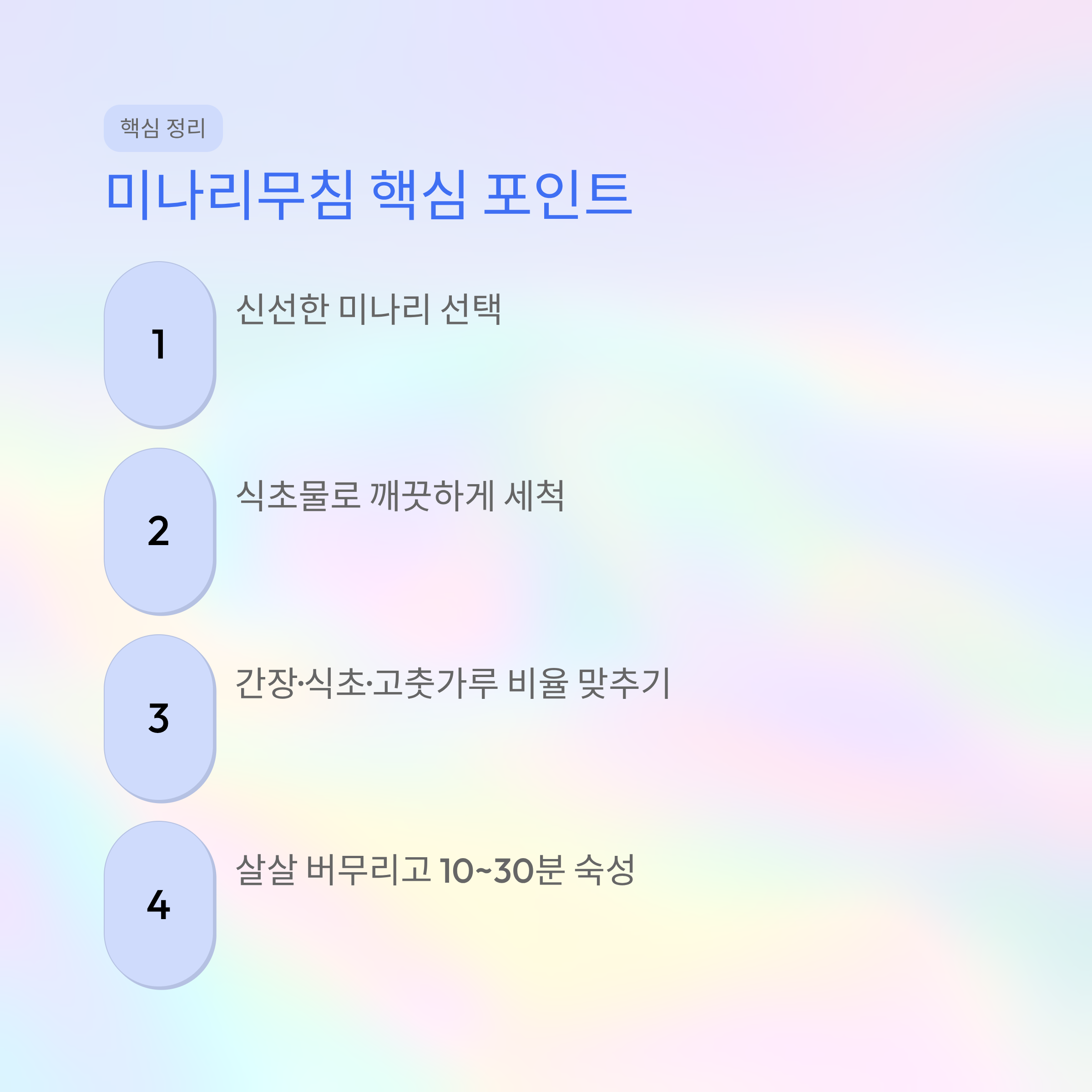 맛있는 미나리무침의 핵심은 새콤매콤한 양념 균형입니다.