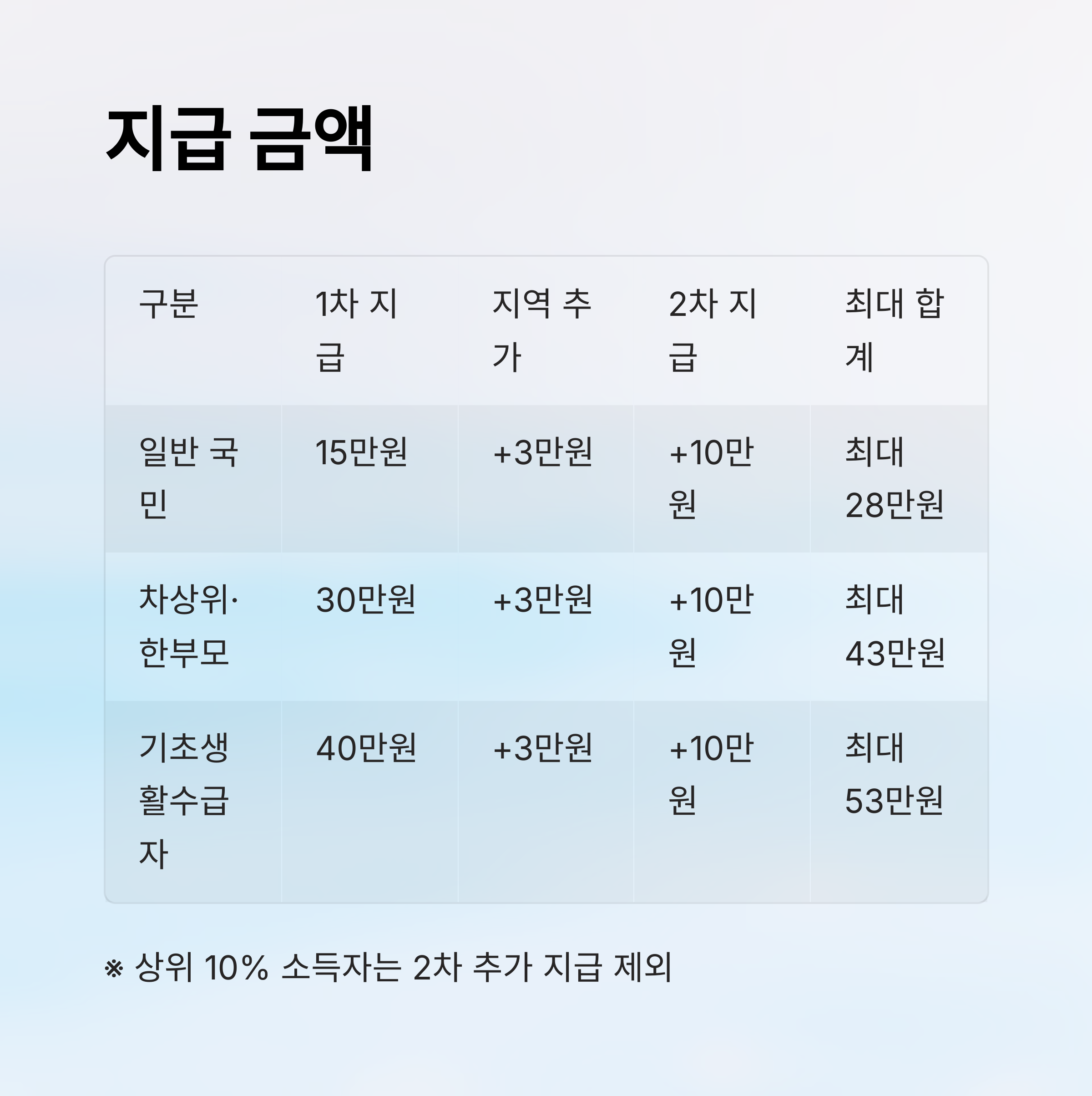 | 구분 | 1차 지급 | 지역 추가 | 2차 지급 | 최대 합계 |