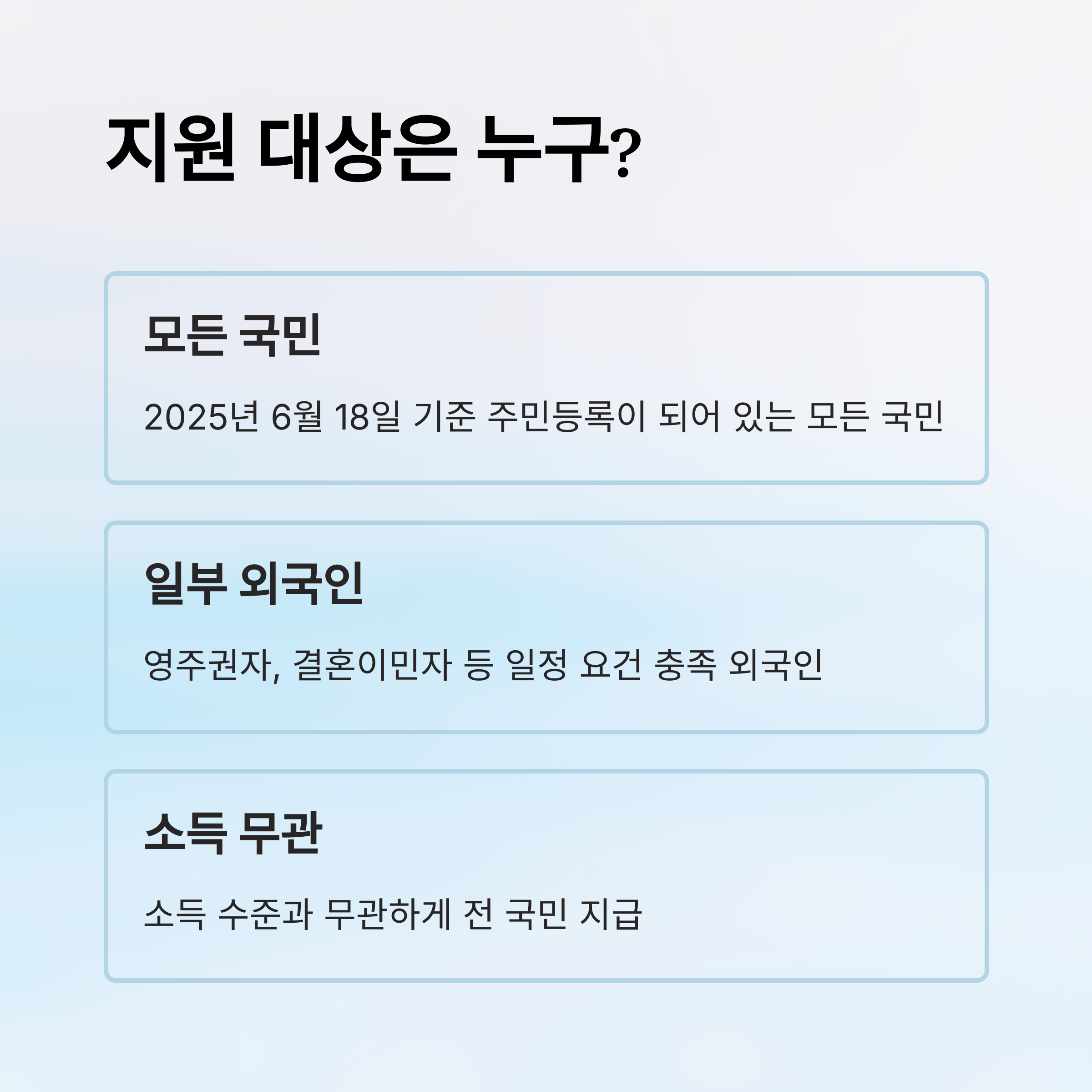 기본 원칙민생회복 소비쿠폰은 지역경제 활성화 및 국민 소득 지원을 위한 취지로, 원칙적으로 대한민국 국민을 대상으로 합니다.단, 내국인과 연관성 높거나 일정한 자격을 갖춘 일부 외국인