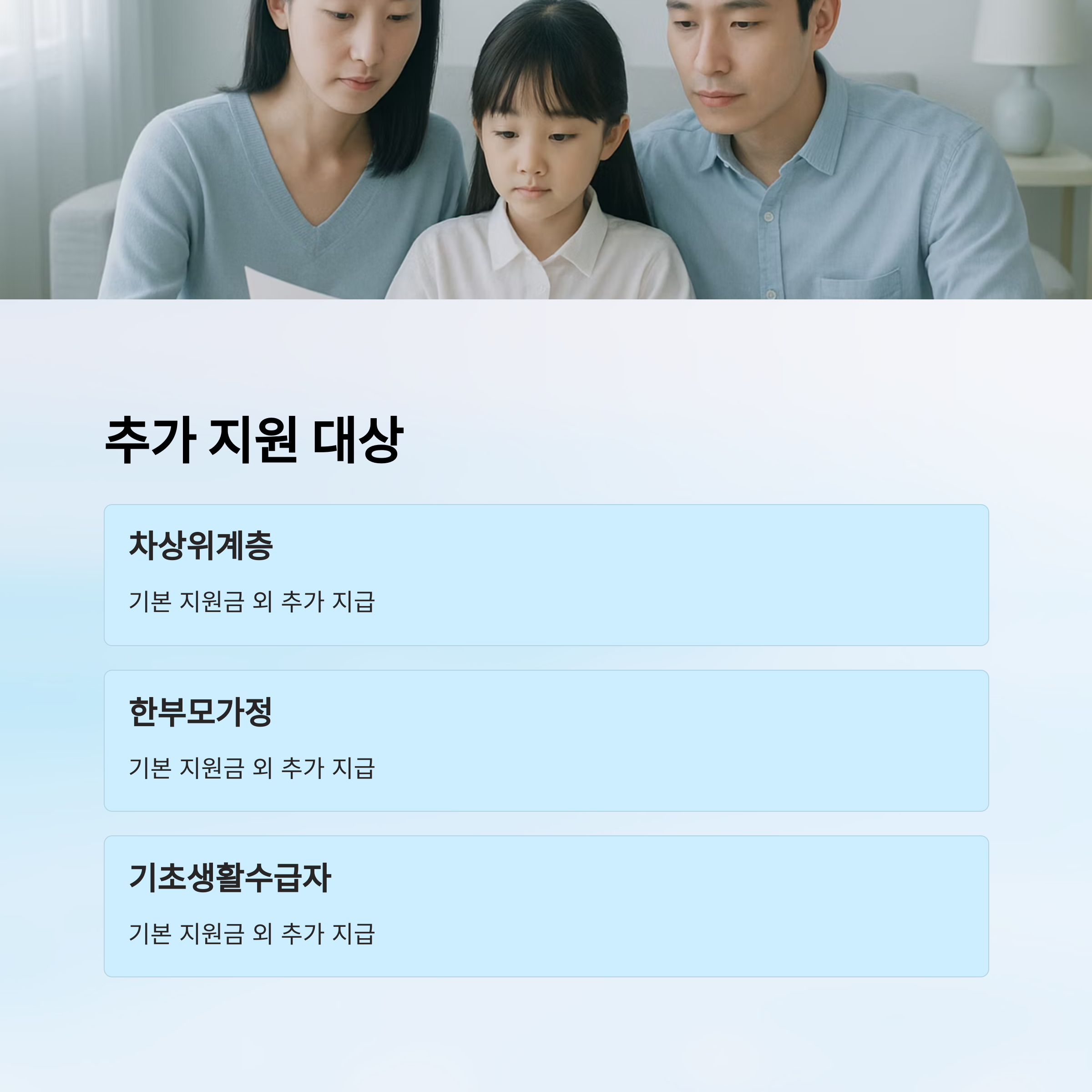 - 추가 지원 대상: 차상위계층, 한부모가정, 기초생활수급자에게는 별도 추가 지급
