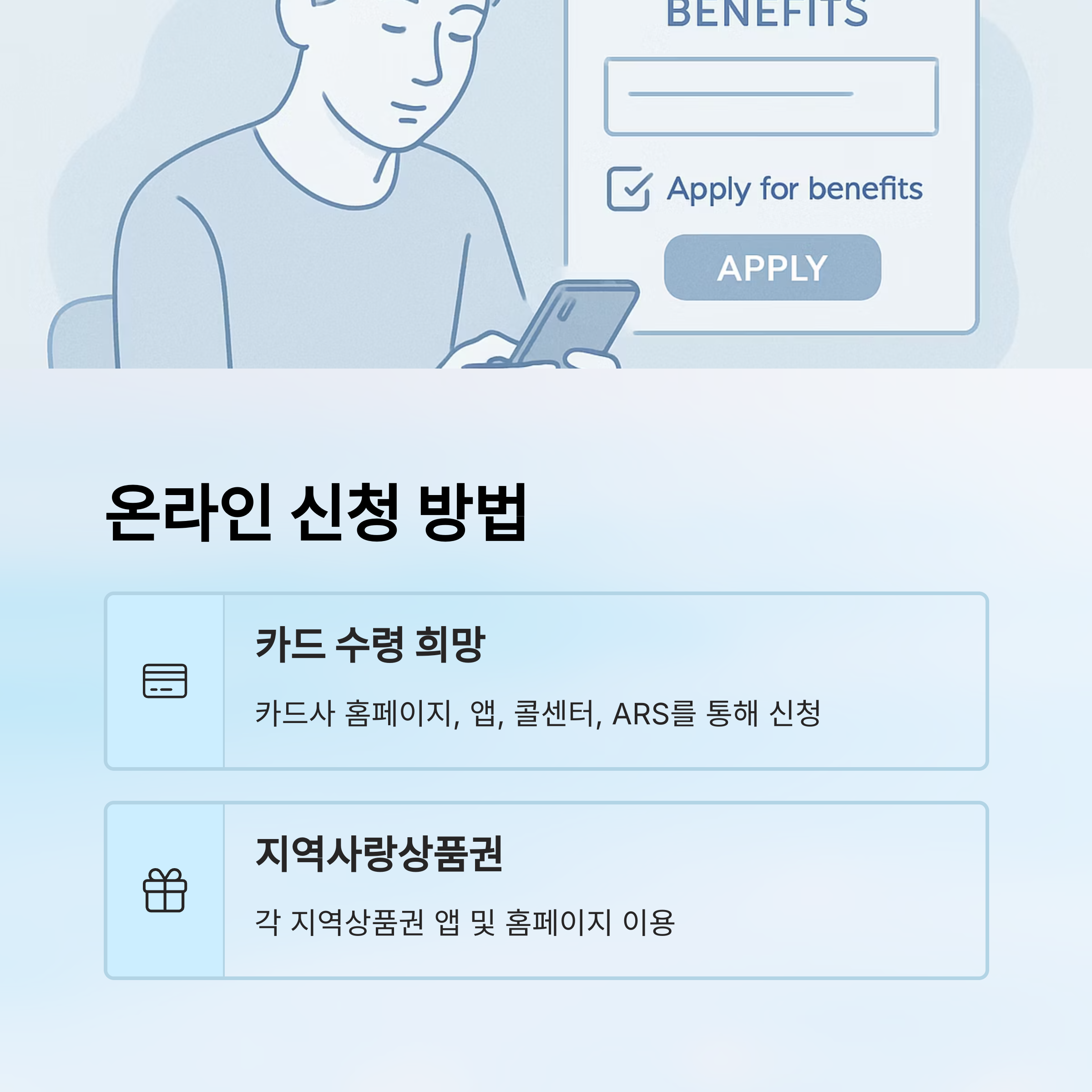 - 신용·체크카드 수령 희망 시: 카드사 홈페이지, 앱, 콜센터, ARS를 통해 신청