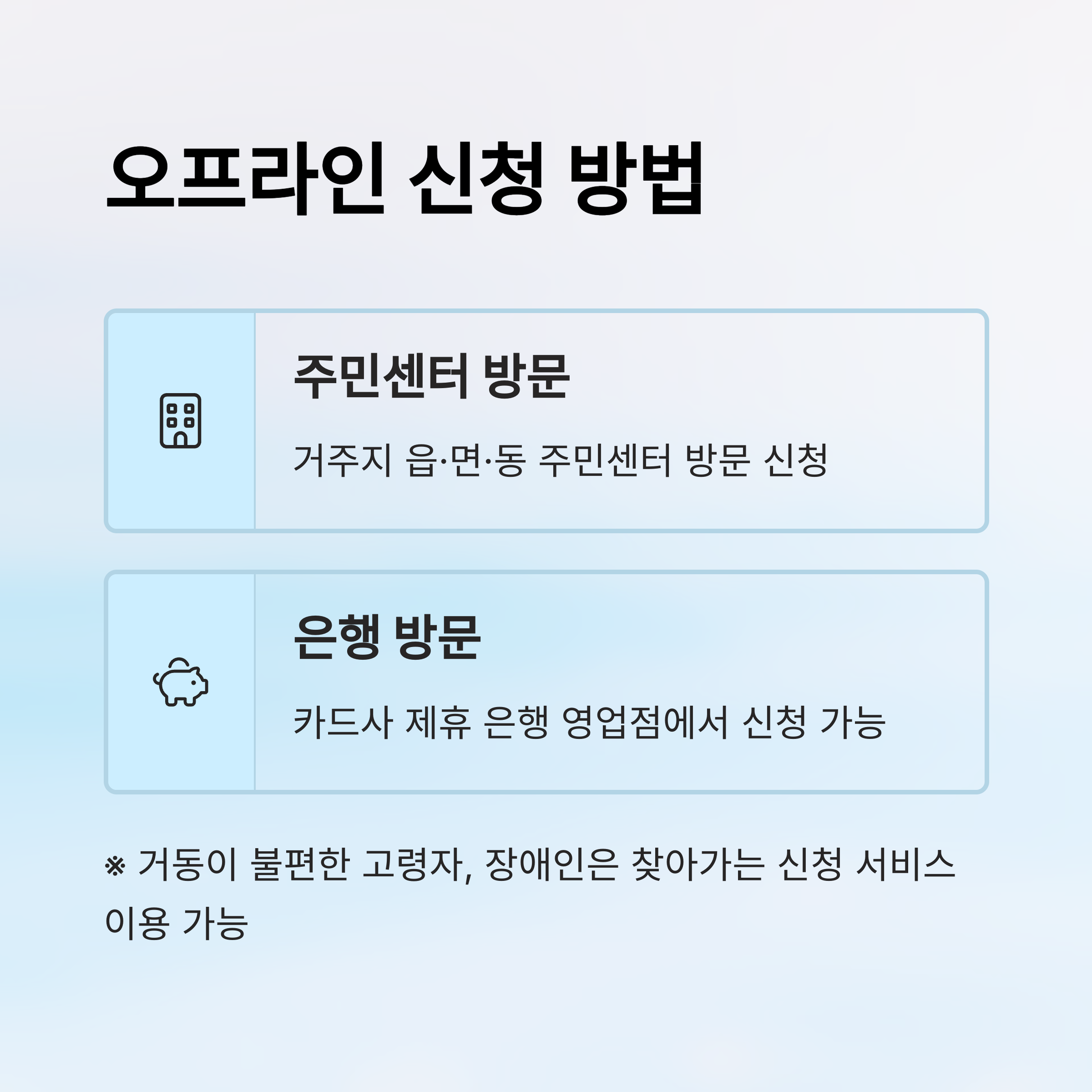 - 거동이 불편한 고령자, 장애인 등은 주민센터나 시청에 요청 시 직접 방문 접수