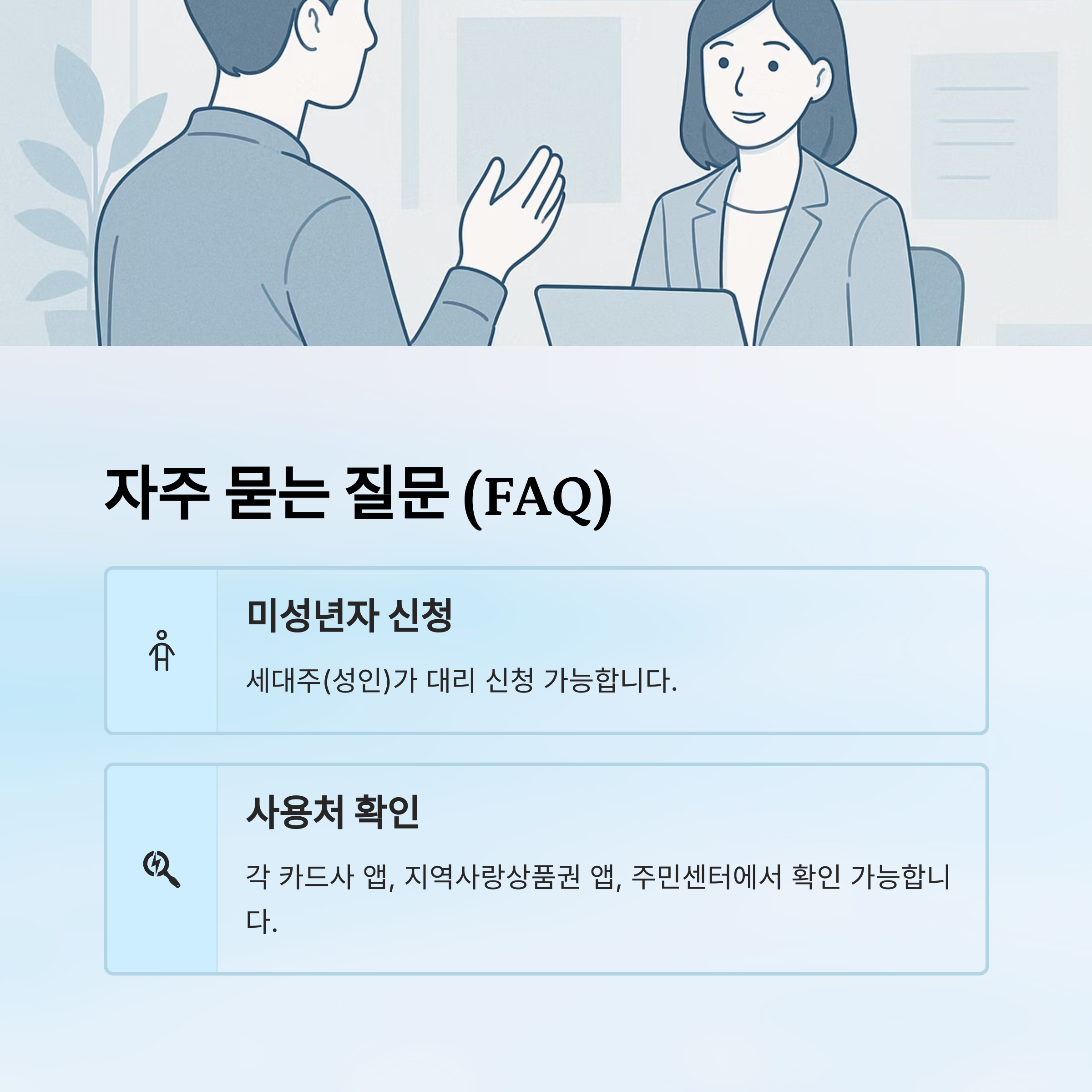 A. 각 카드사 앱, 지역사랑상품권 앱, 주민센터에서 확인 가능합니다.