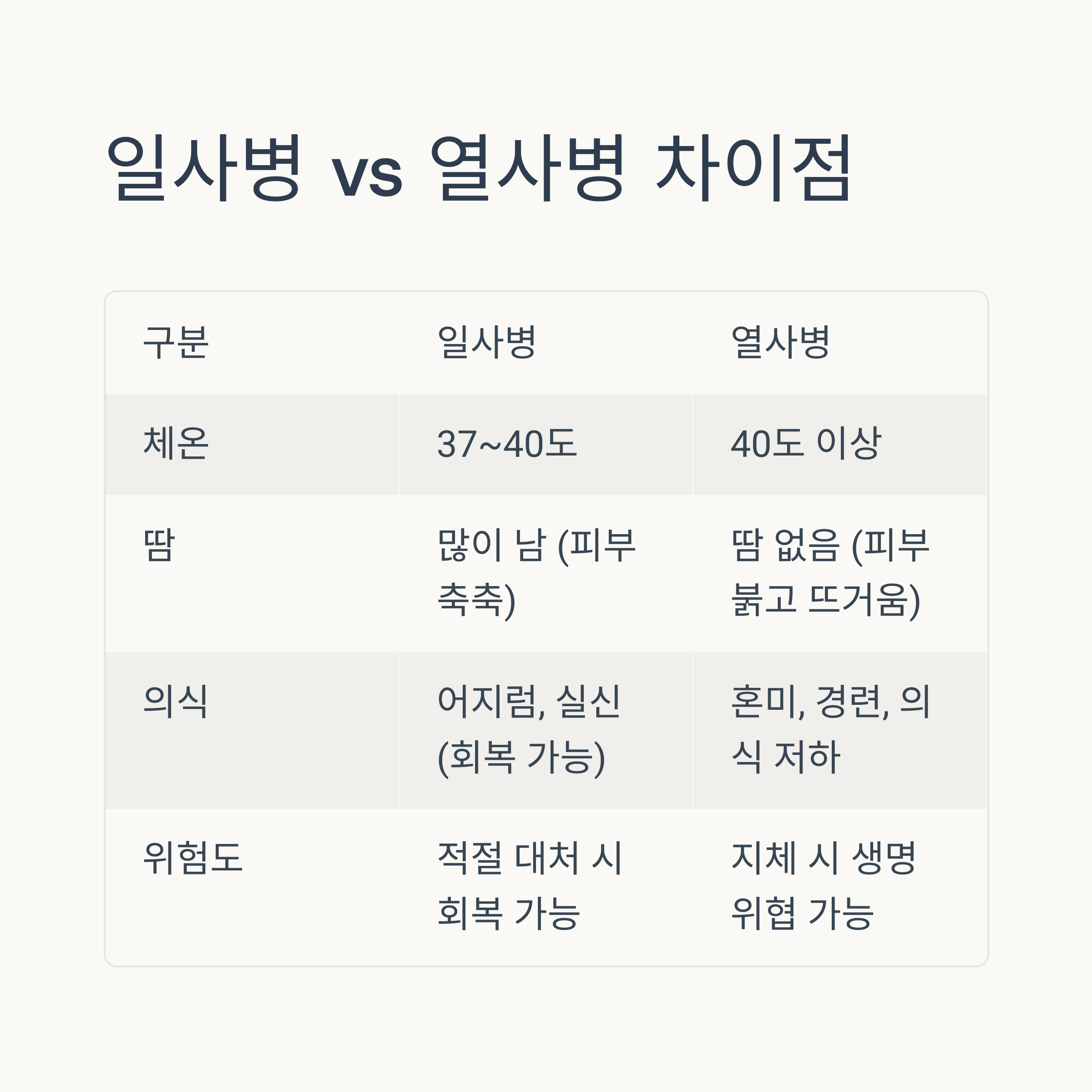 | 대처 | 시원한 곳에서 휴식 | 즉시 병원 이송 필요 |