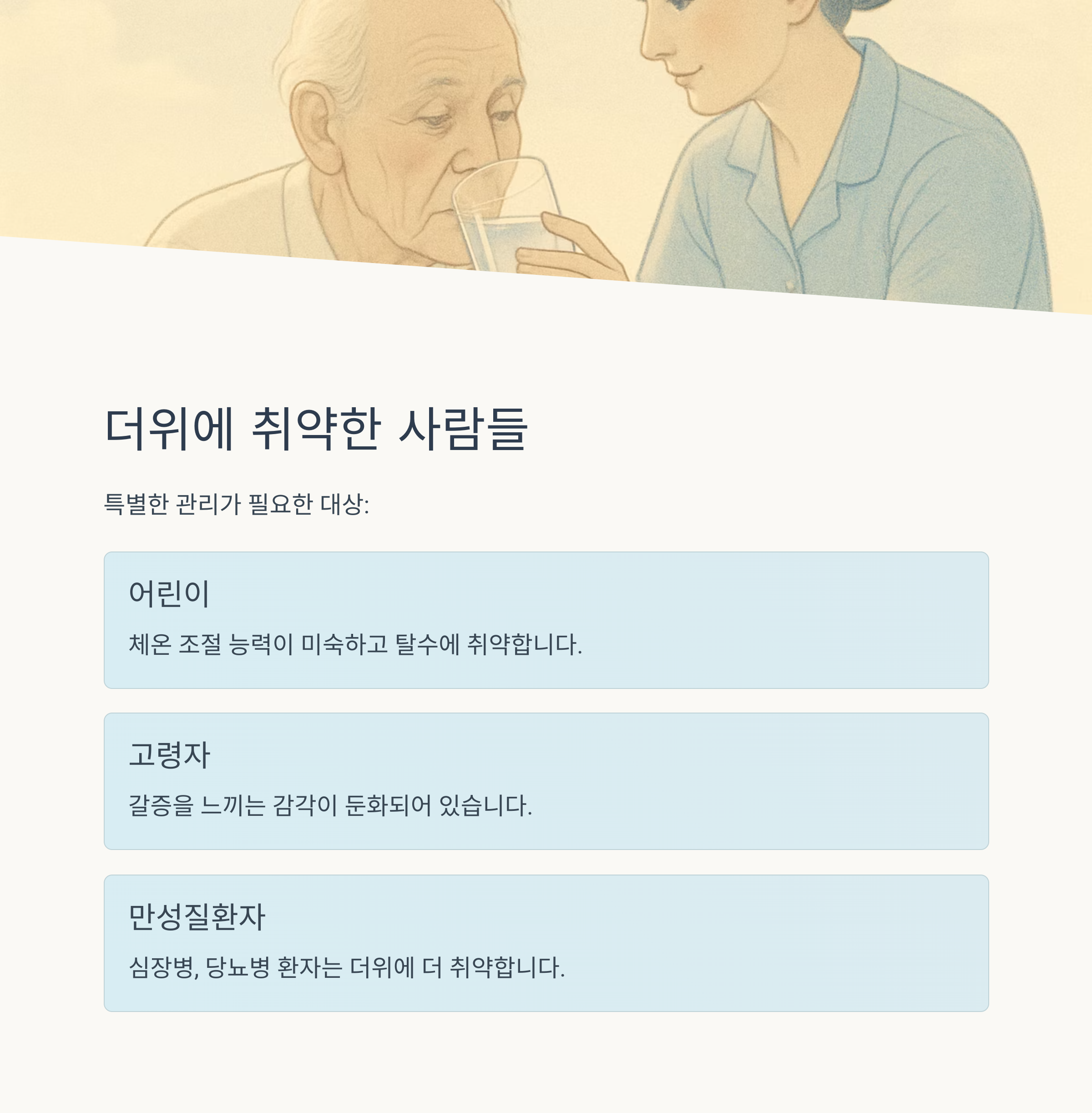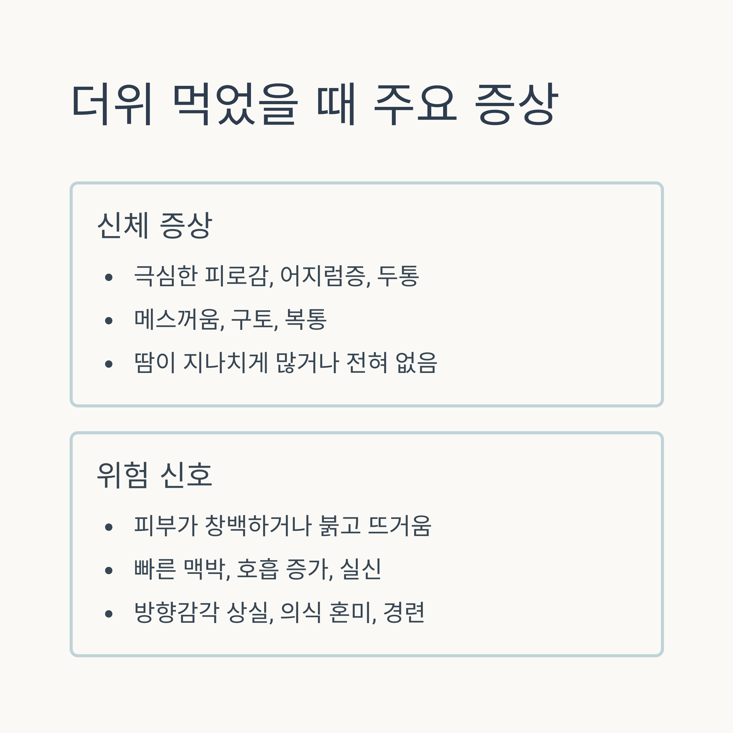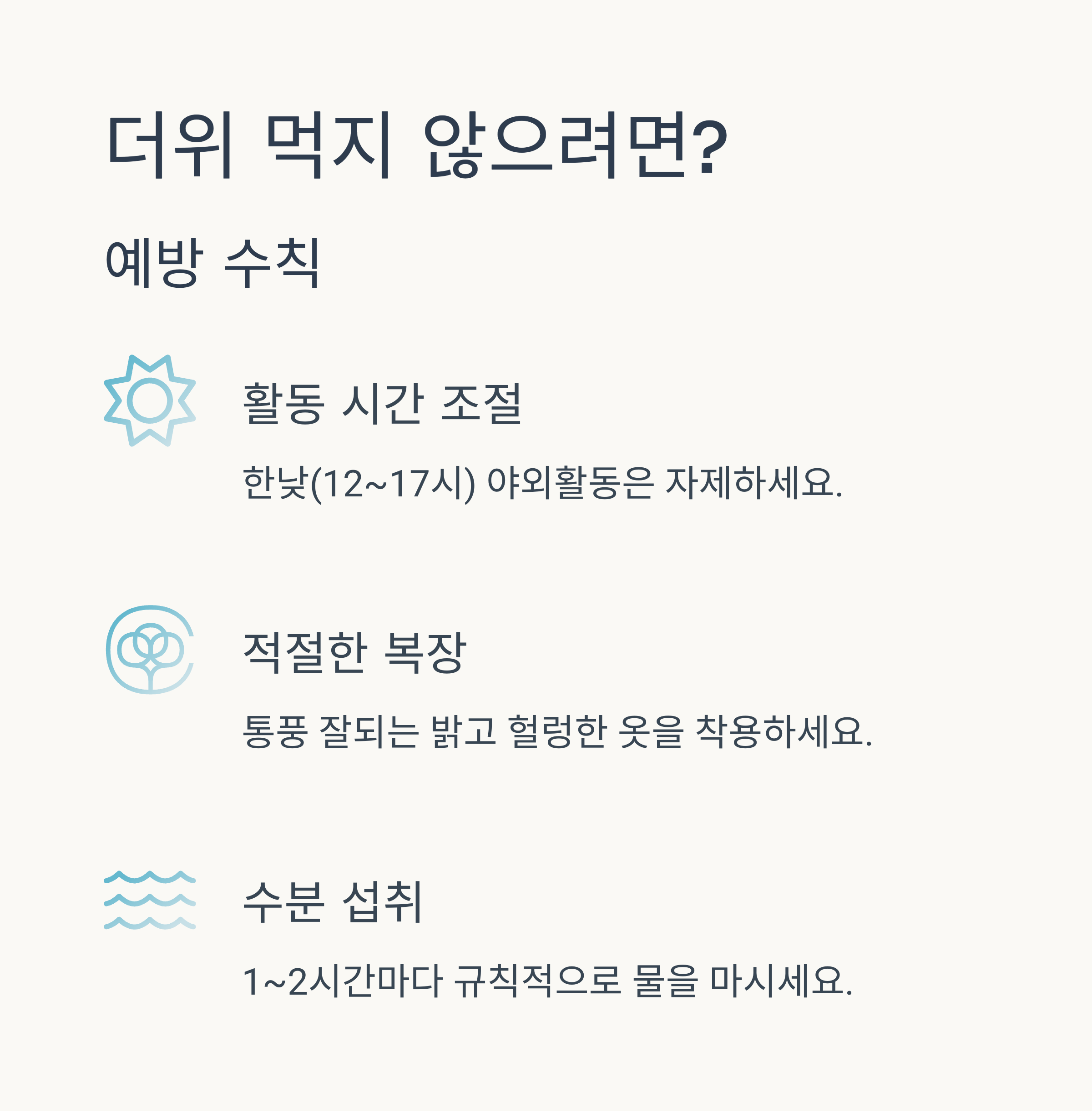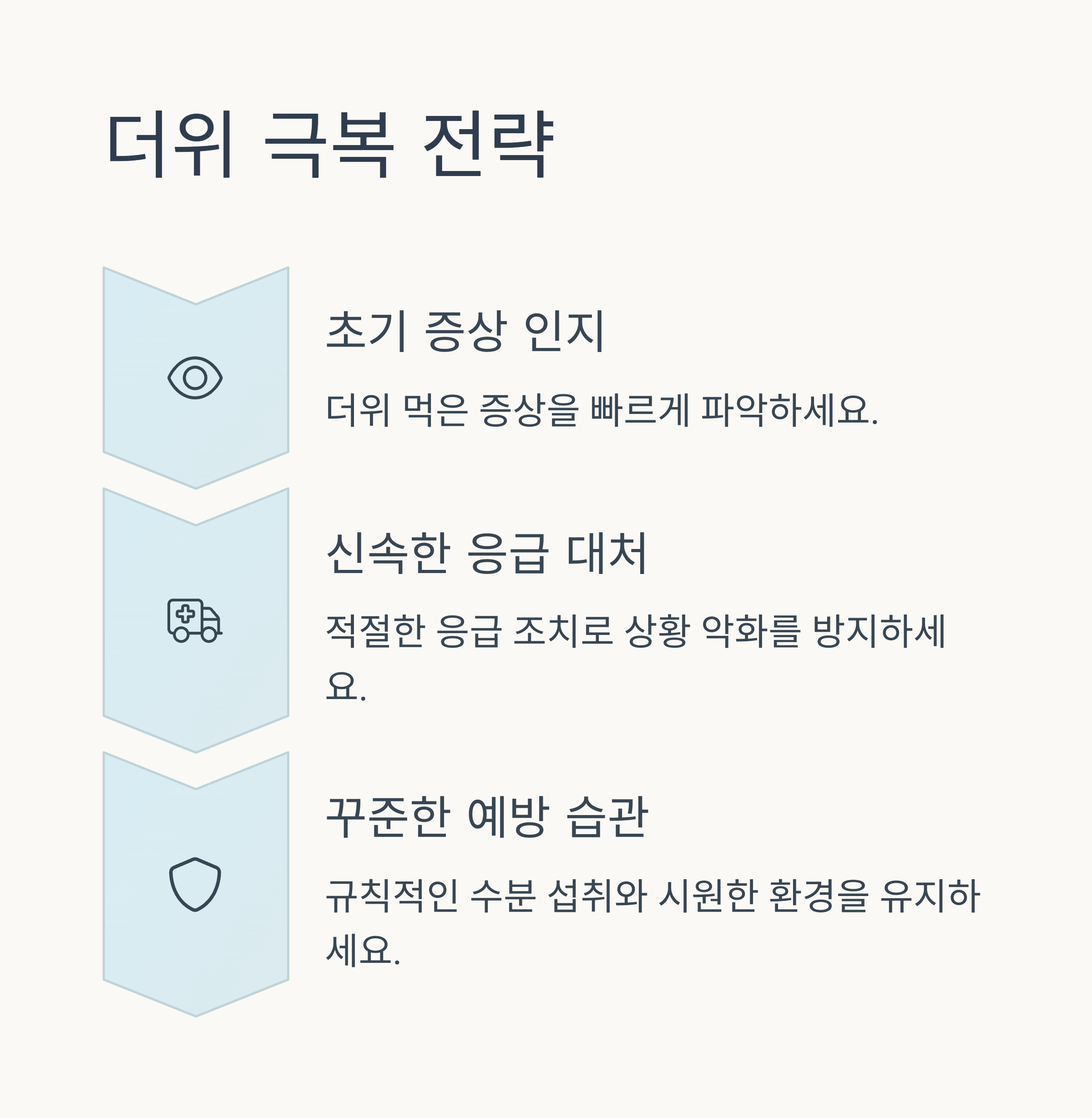 초기 증상 인지 → 신속한 응급 대처 → 꾸준한 예방 습관, 이것이 가장 확실한 더위 극복 전략입니다.