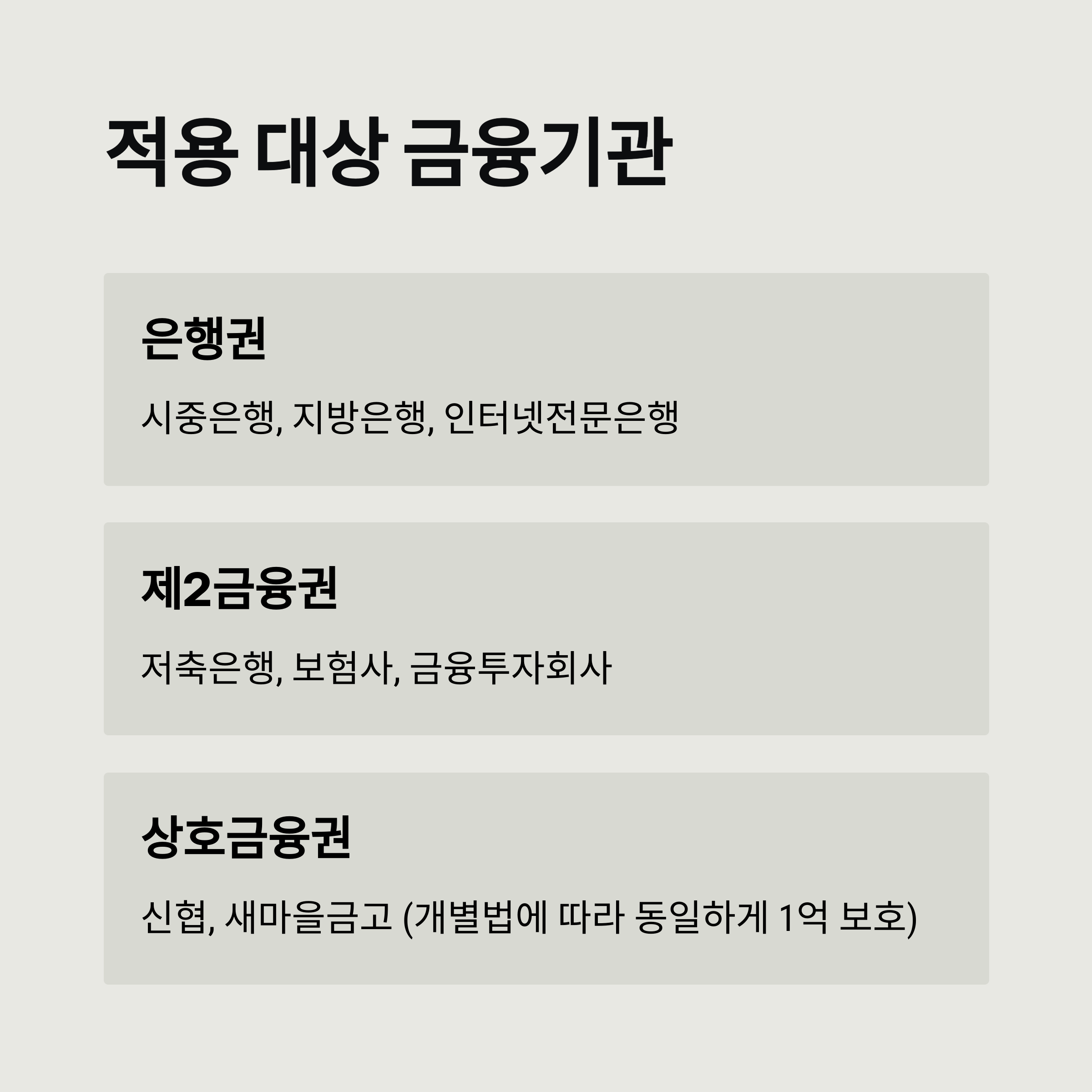- 신협, 새마을금고 등 상호금융권 (개별법에 따라 동일하게 1억 보호)