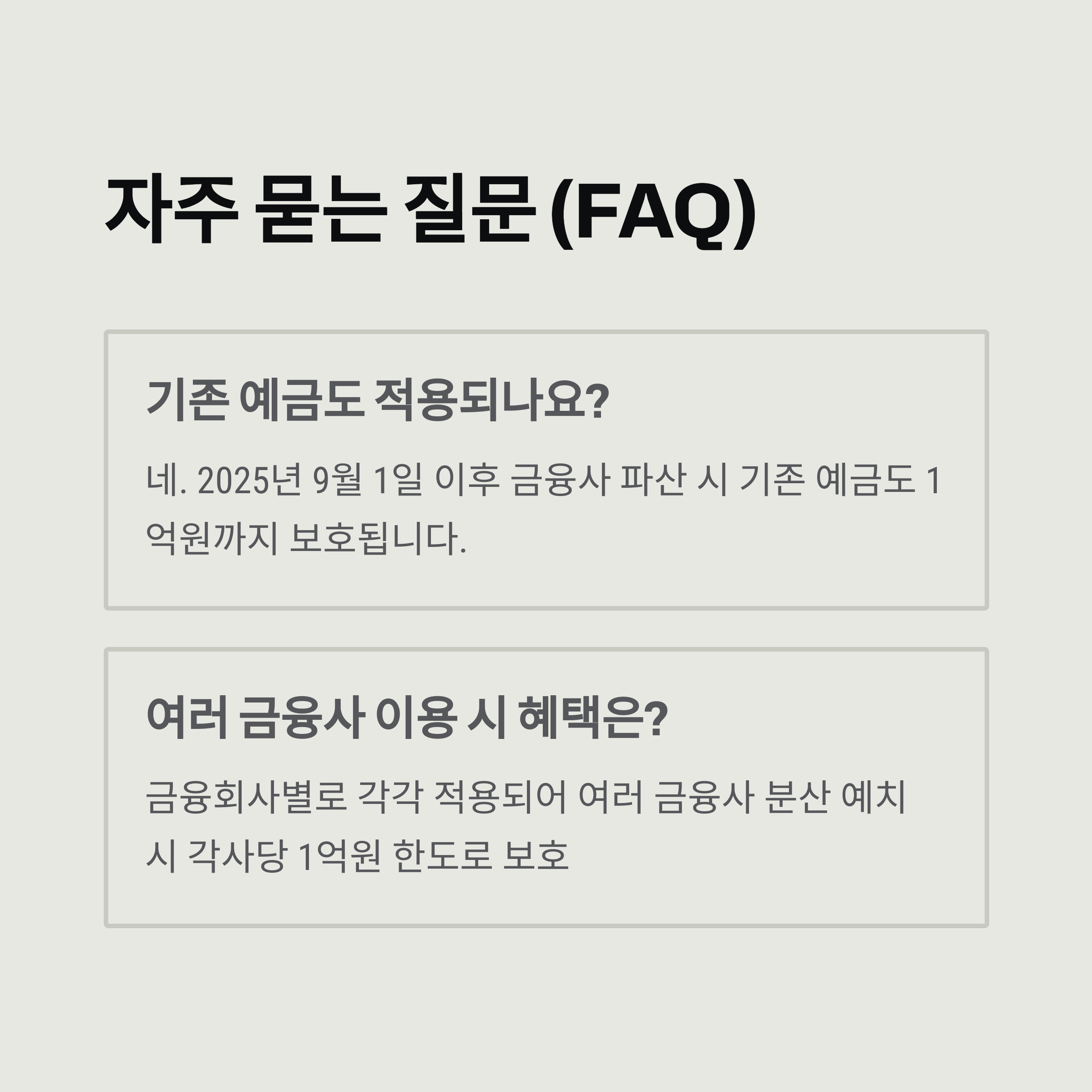 - 적용 시점: 가입 시기와 관계없이, 2025년 9월 1일 이후 해당 금융회사가 파산하거나 영업정지 등 사유가 발생한 경우, 원금과 이자를 합쳐 1억원까지 보호