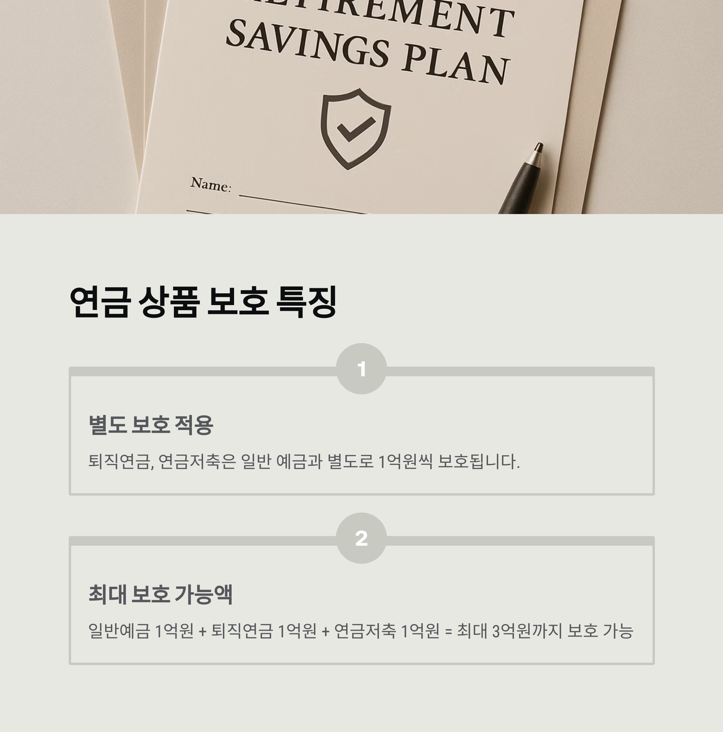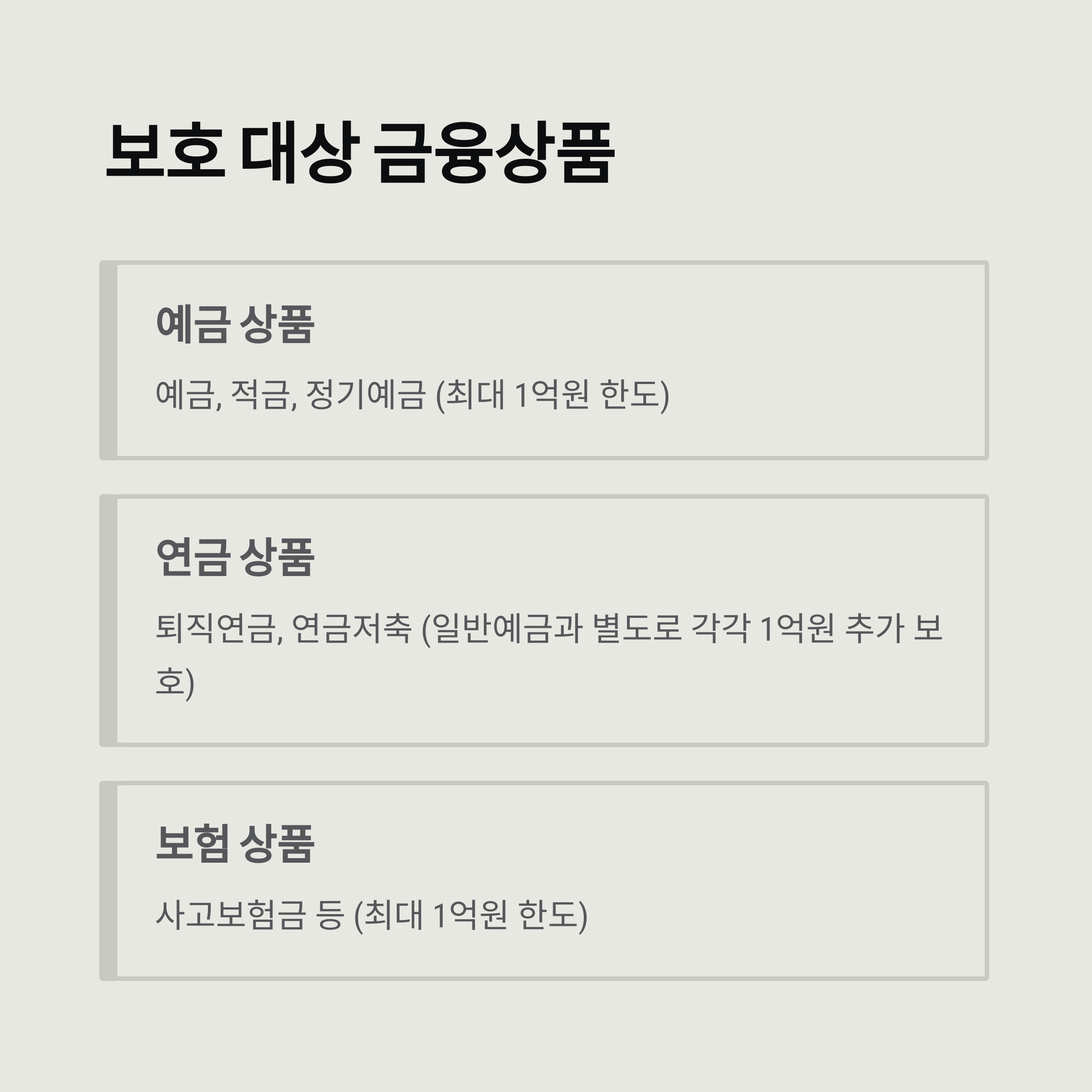 | 보호 대상 | 예금, 적금, 정기예금, 퇴직연금, 연금저축, 사고보험금 등 (각각 최대 1억원 한도) |