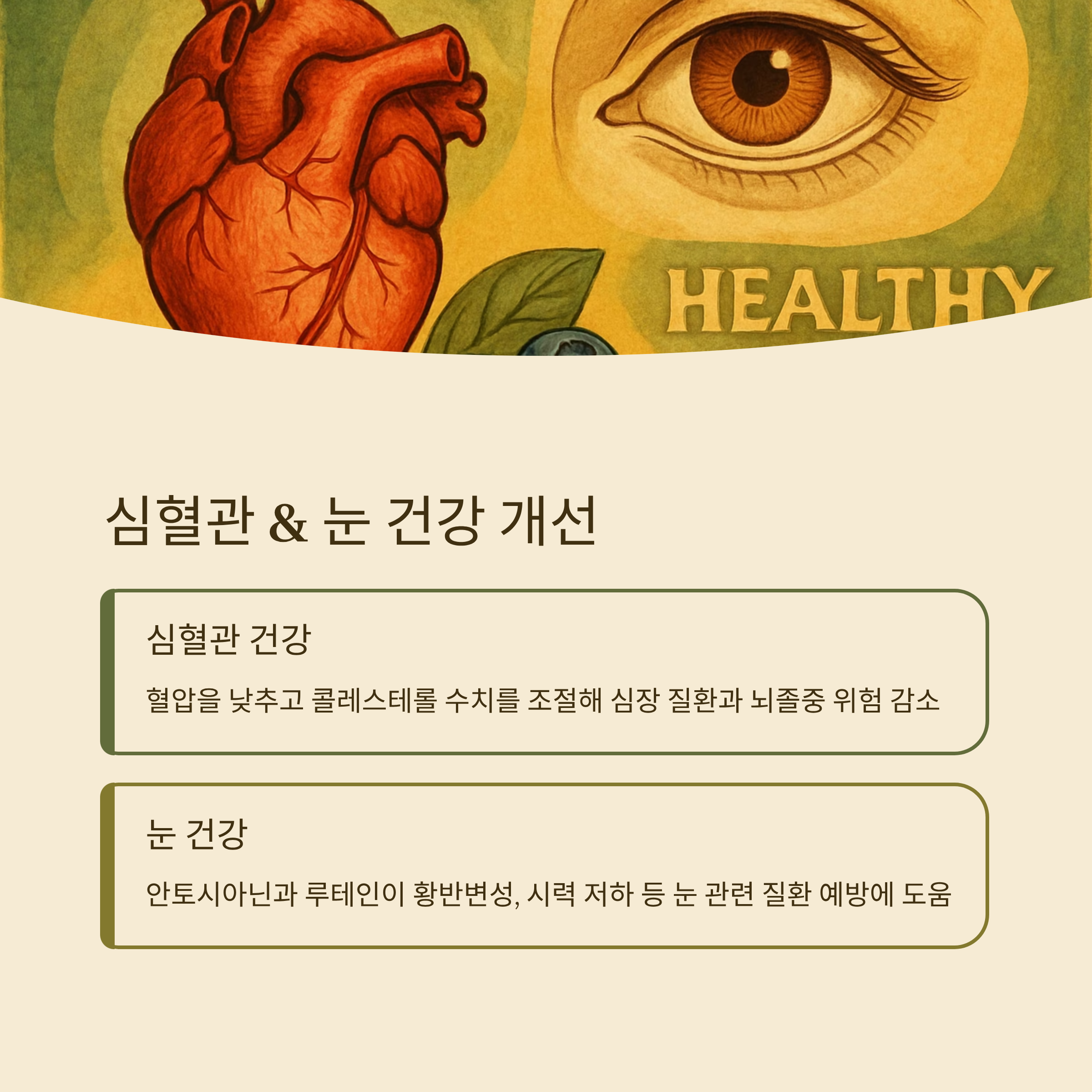 안토시아닌과 루테인이 황반변성, 시력 저하 등 눈 관련 질환 예방에 긍정적 영향을 미칩니다.