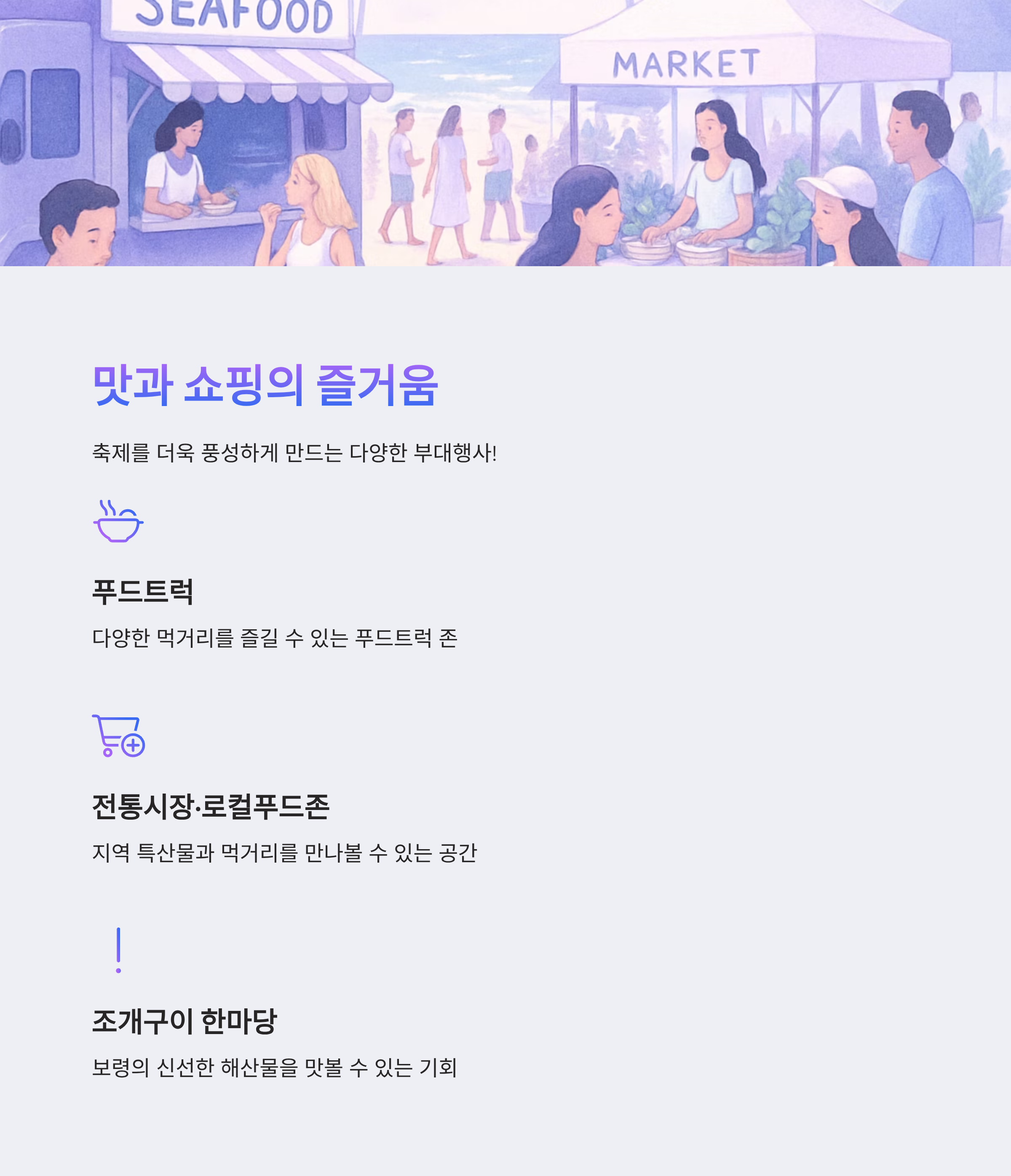 - 축제 기간 대천해수욕장 일대에서 다양한 퍼레이드, 조개구이 한마당, 청년희망부스 등도 연계 운영.