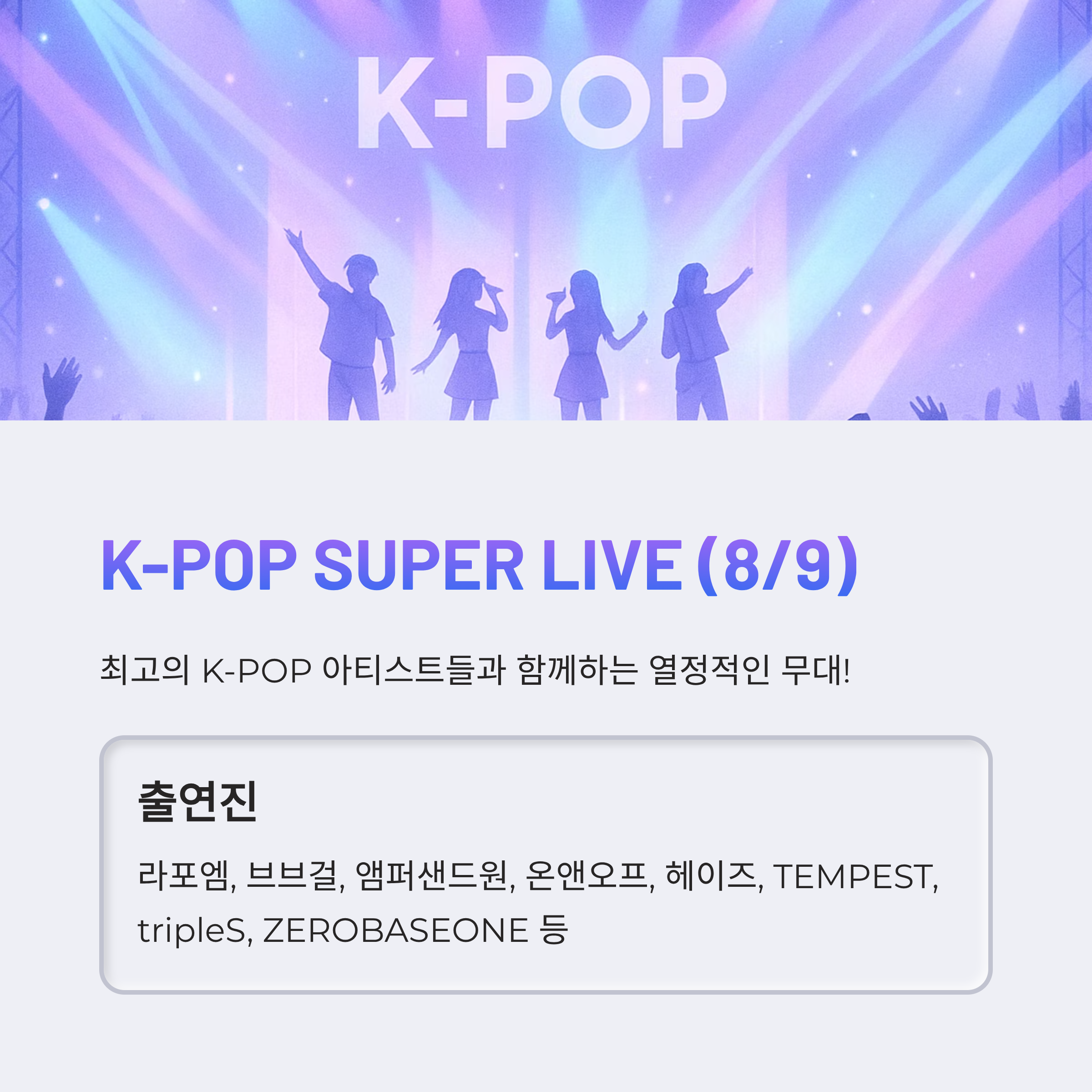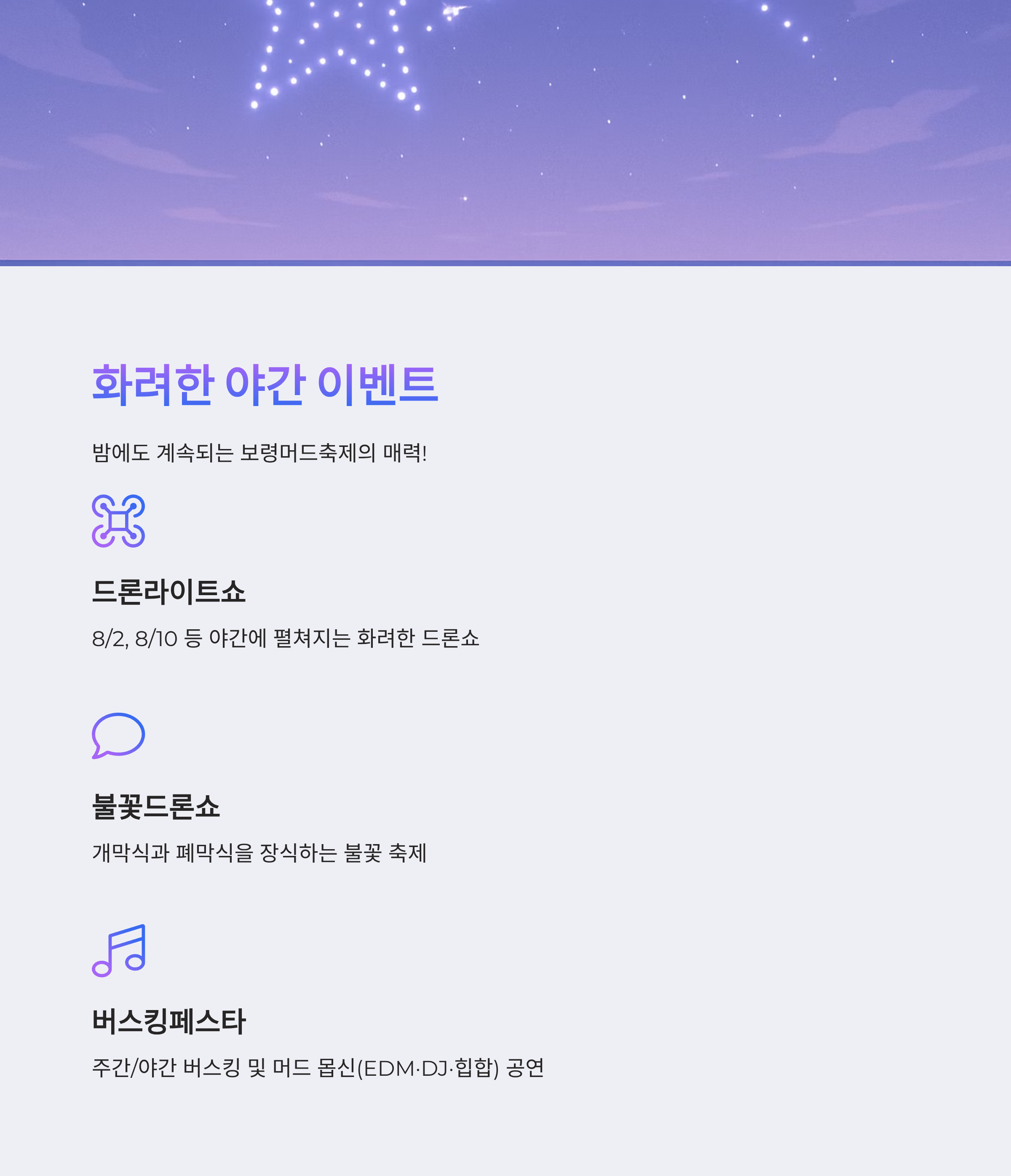 - 드론라이트쇼: 8/2, 8/10 등 야간