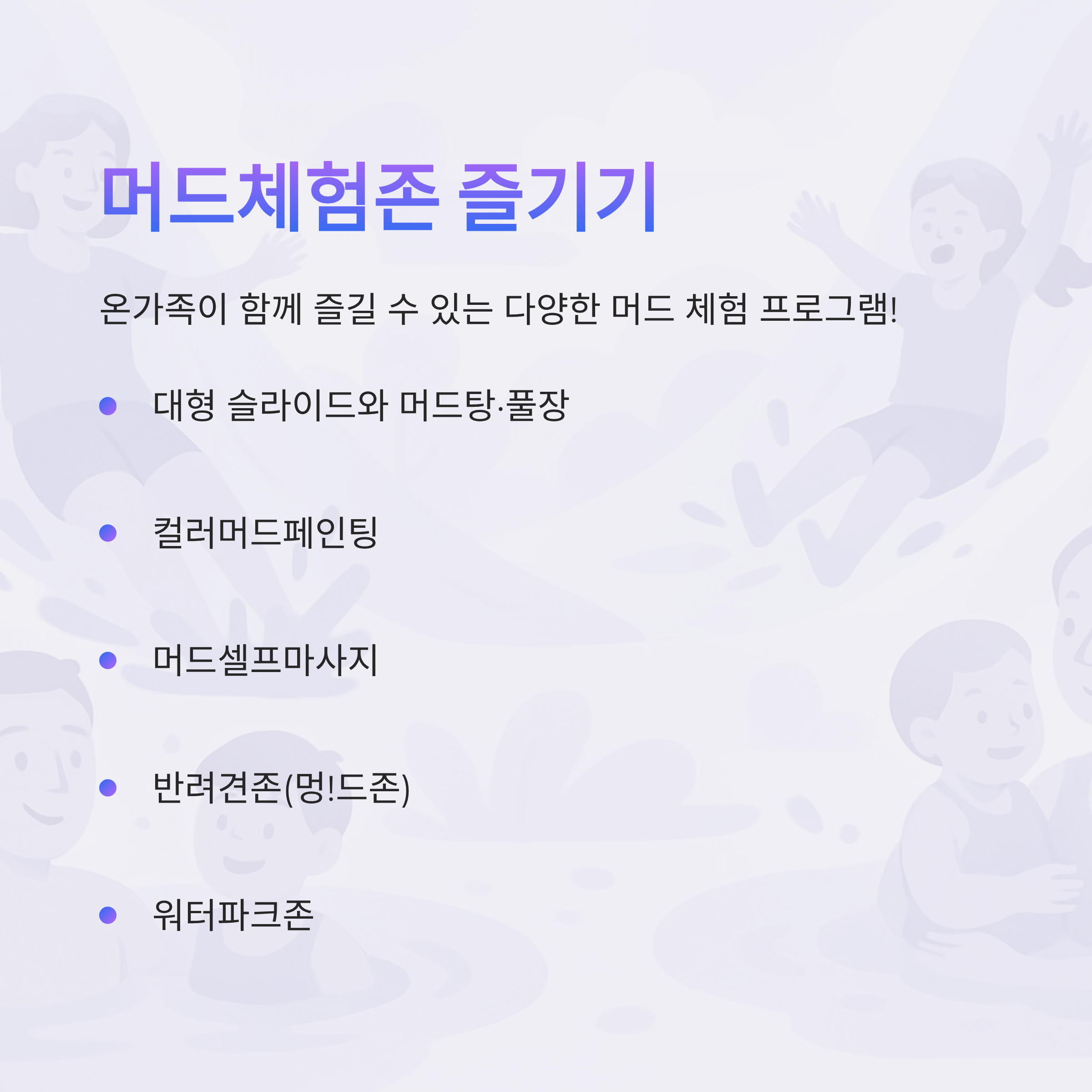 - 머드체험존(일반/패밀리/워터파크): 대형 슬라이드, 머드탕·풀장, 컬러머드페인팅, 머드셀프마사지, 반려견존(멍!드존), 워터파크존 등 온가족 체험형 프로그램