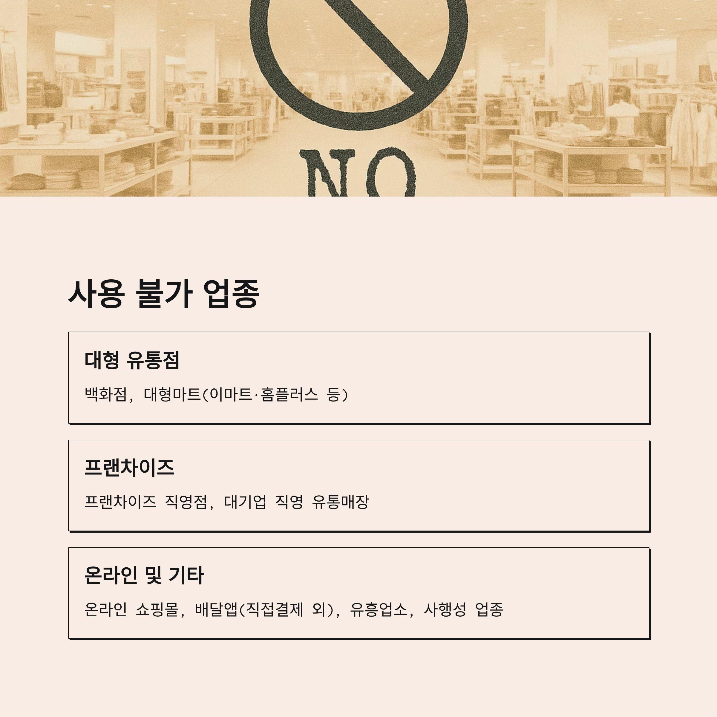| 사용 불가 업종 | 대형마트, 백화점, 온라인몰, 유흥업종 등 |