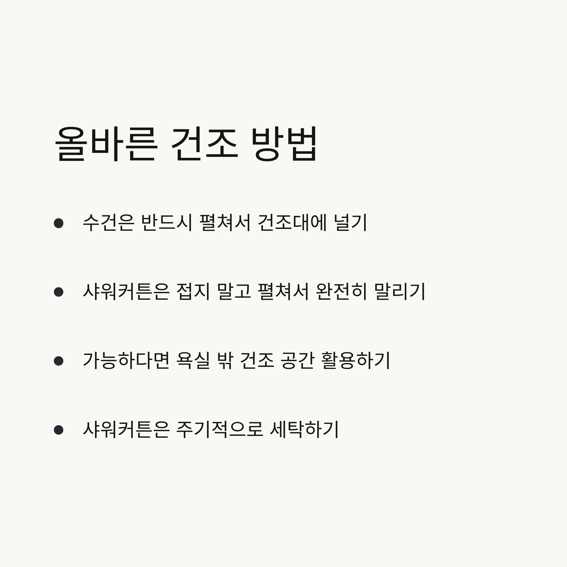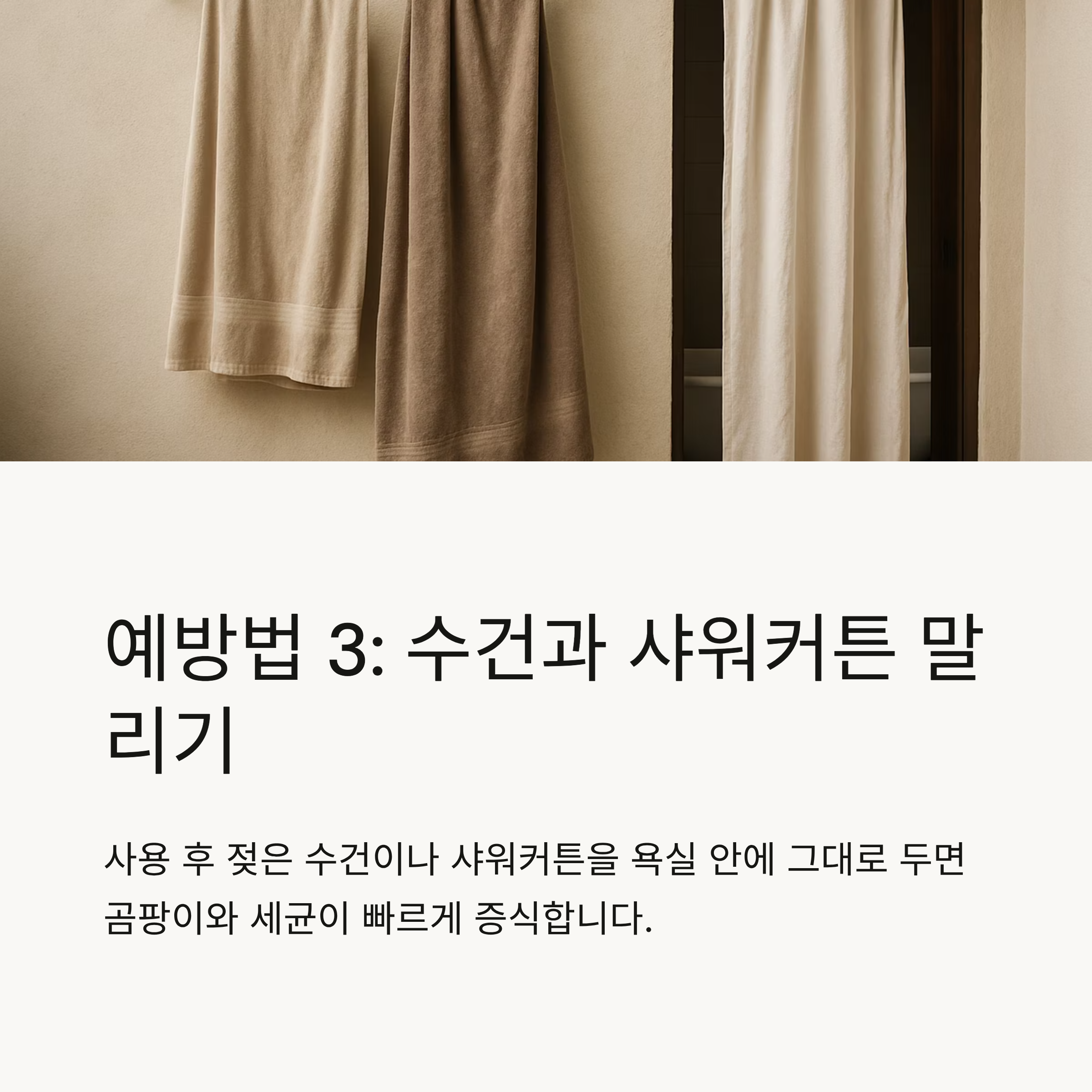 사용 후 젖은 수건이나 샤워커튼을 욕실 안에 그대로 두면 곰팡이·세균이 빠르게 증식합니다.