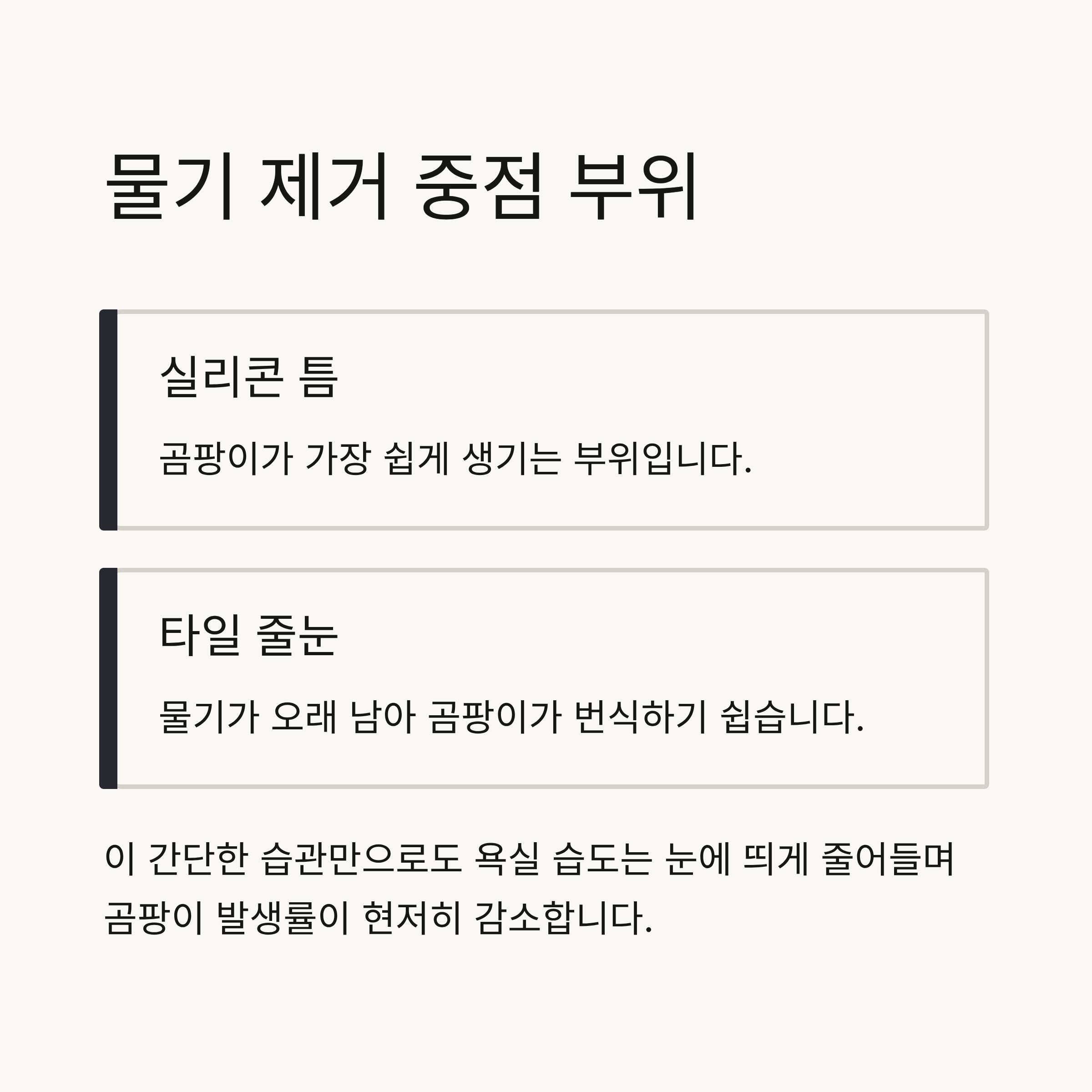 이 간단한 습관만으로도 욕실 습도는 눈에 띄게 줄어들며 곰팡이 발생률이 현저히 감소합니다.