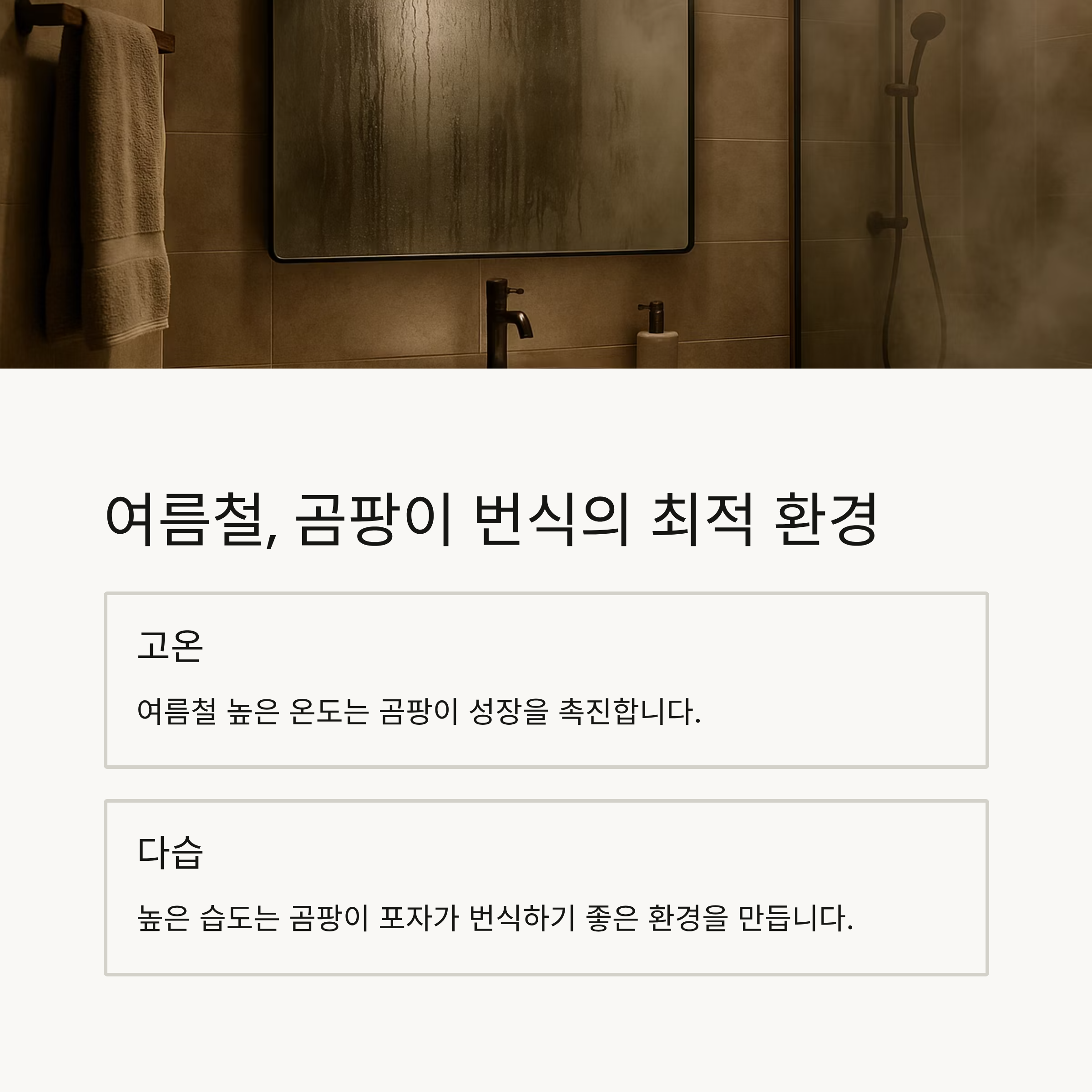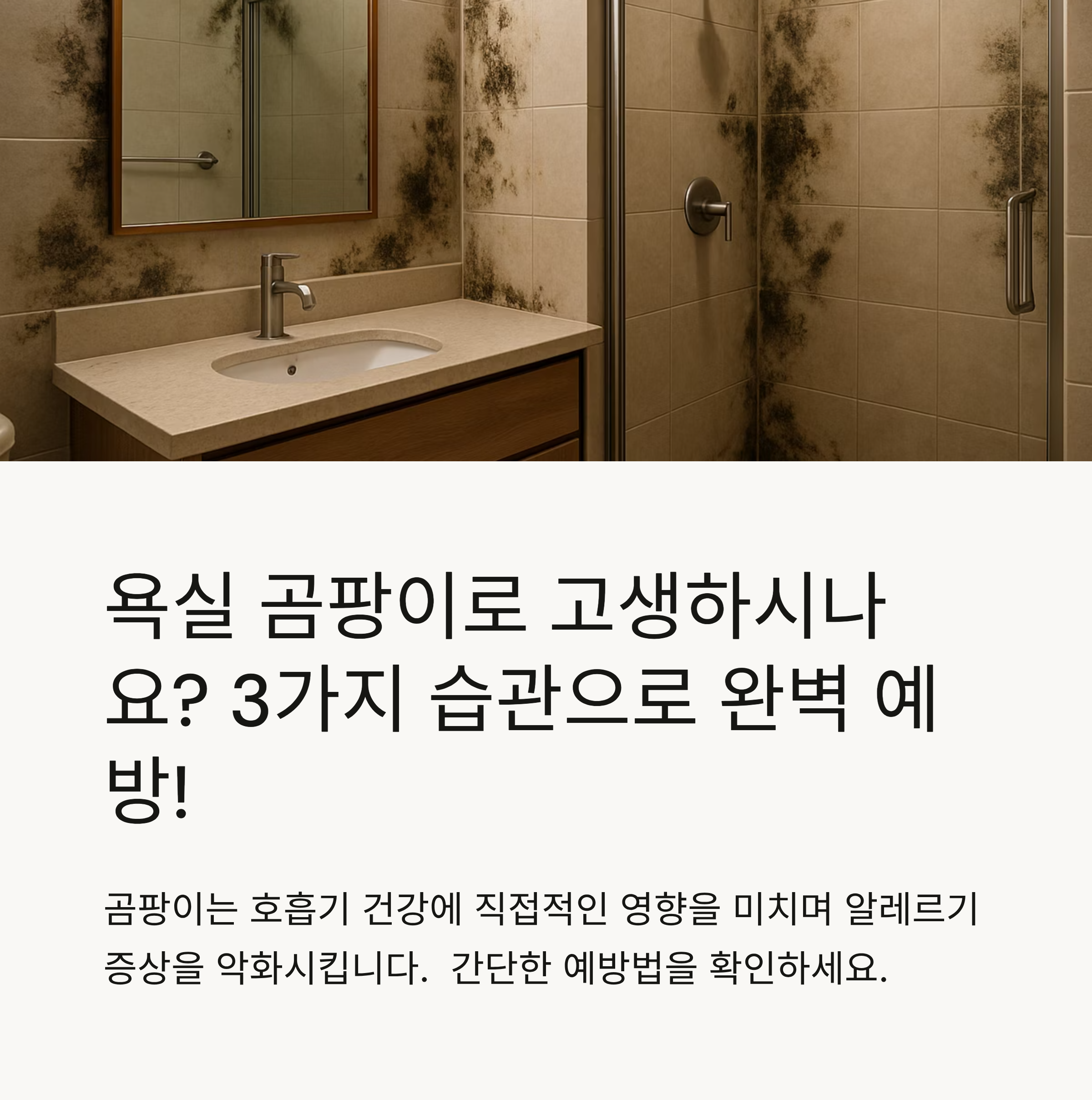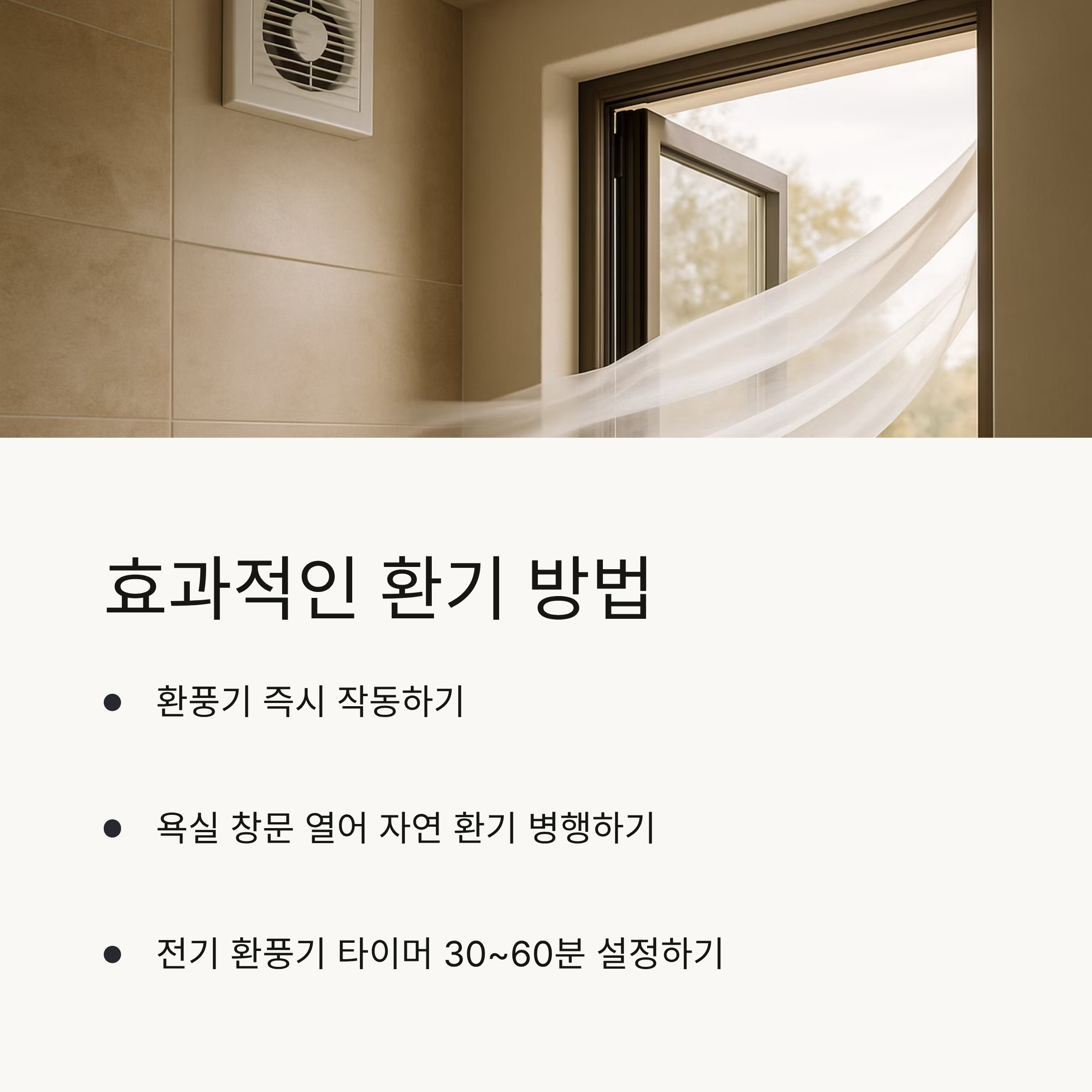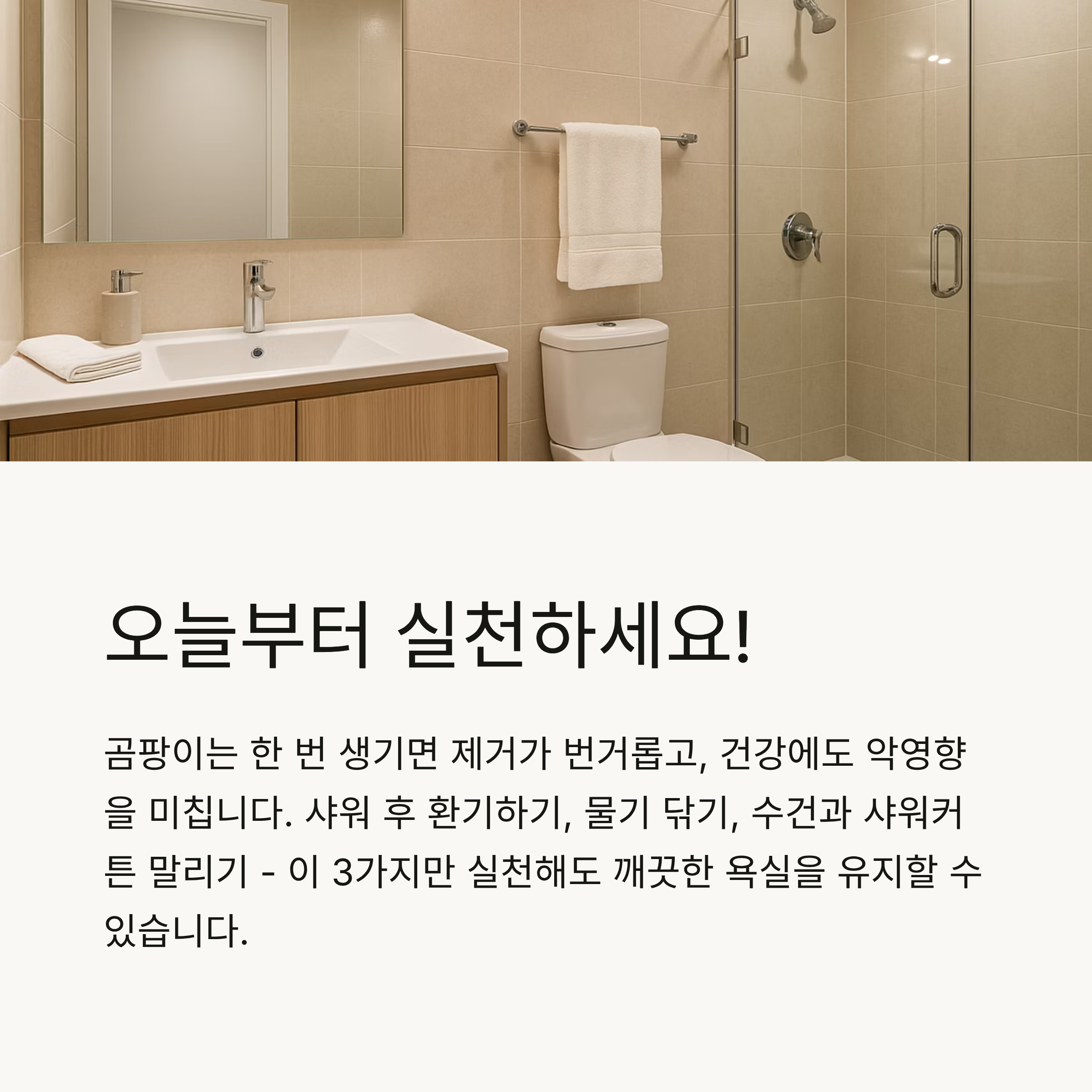 - 샤워가 끝나면 욕실 문을 30분 이상 열어두거나, 환풍기를 즉시 작동하세요.