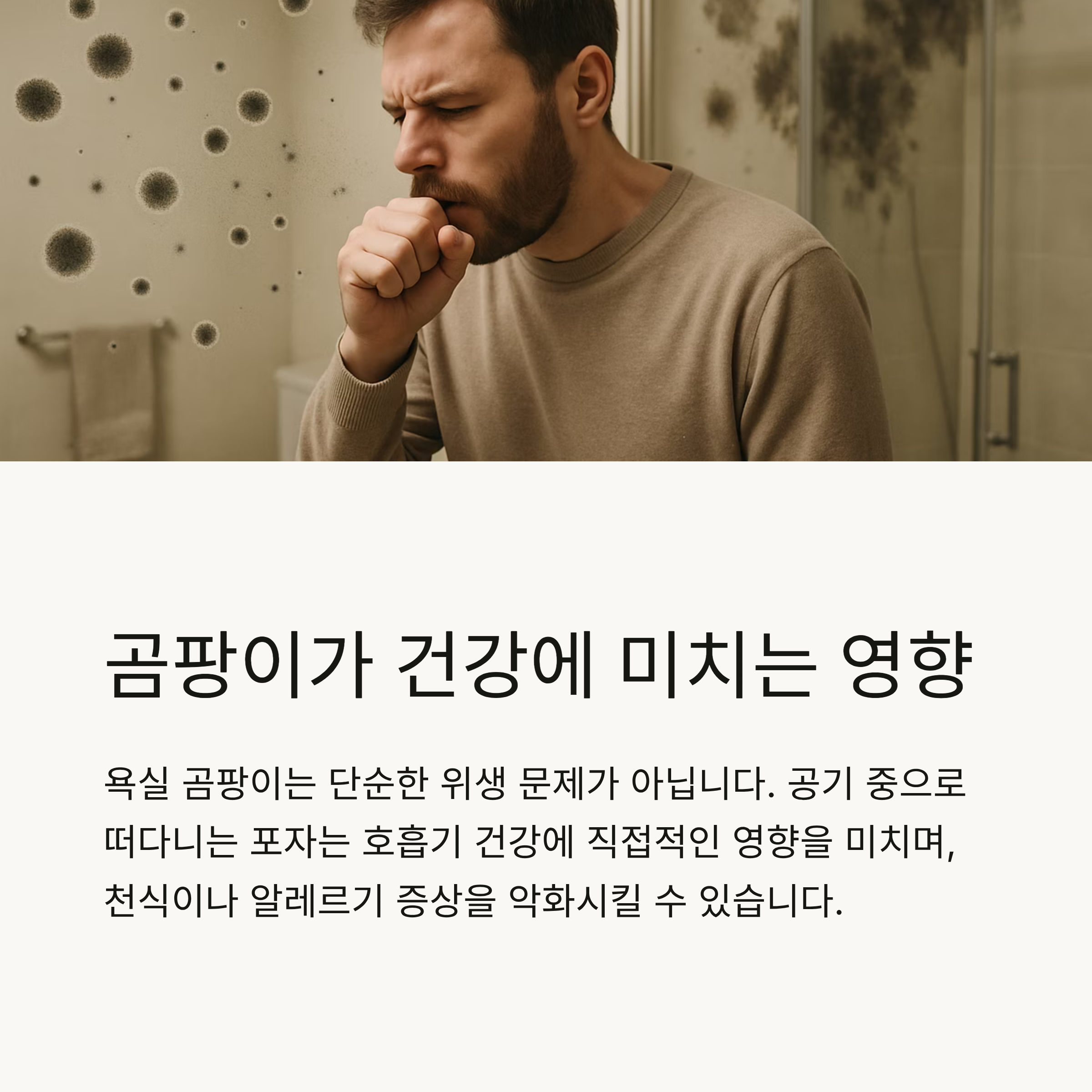 욕실의 곰팡이는 단순한 위생 문제가 아닙니다. 공기 중으로 떠다니는 곰팡이 포자는 호흡기 건강에 직접적인 영향을 미치며, 천식이나 알레르기 증상을 악화시킬 수 있습니다. 특히 여름철, 고온다습한 환경은 곰팡이 번식에 최적이므로, 샤워 후 관리 습관이 매우 중요합니다.