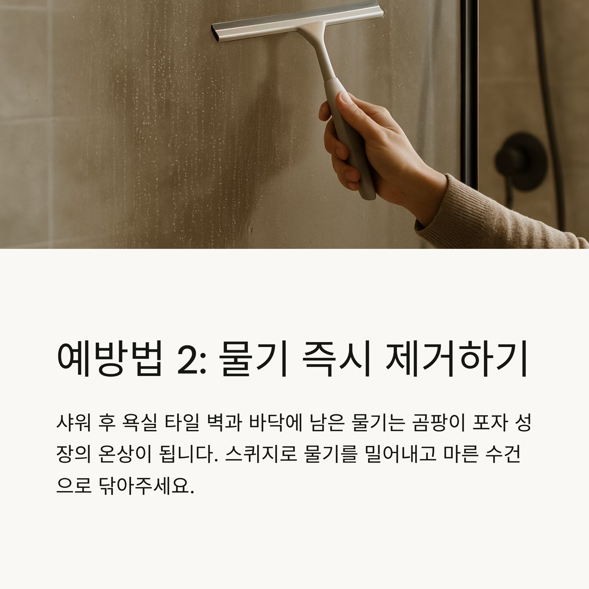 샤워 후 욕실 타일 벽과 바닥에 남은 물기는 곰팡이 포자 성장의 온상이 됩니다.
