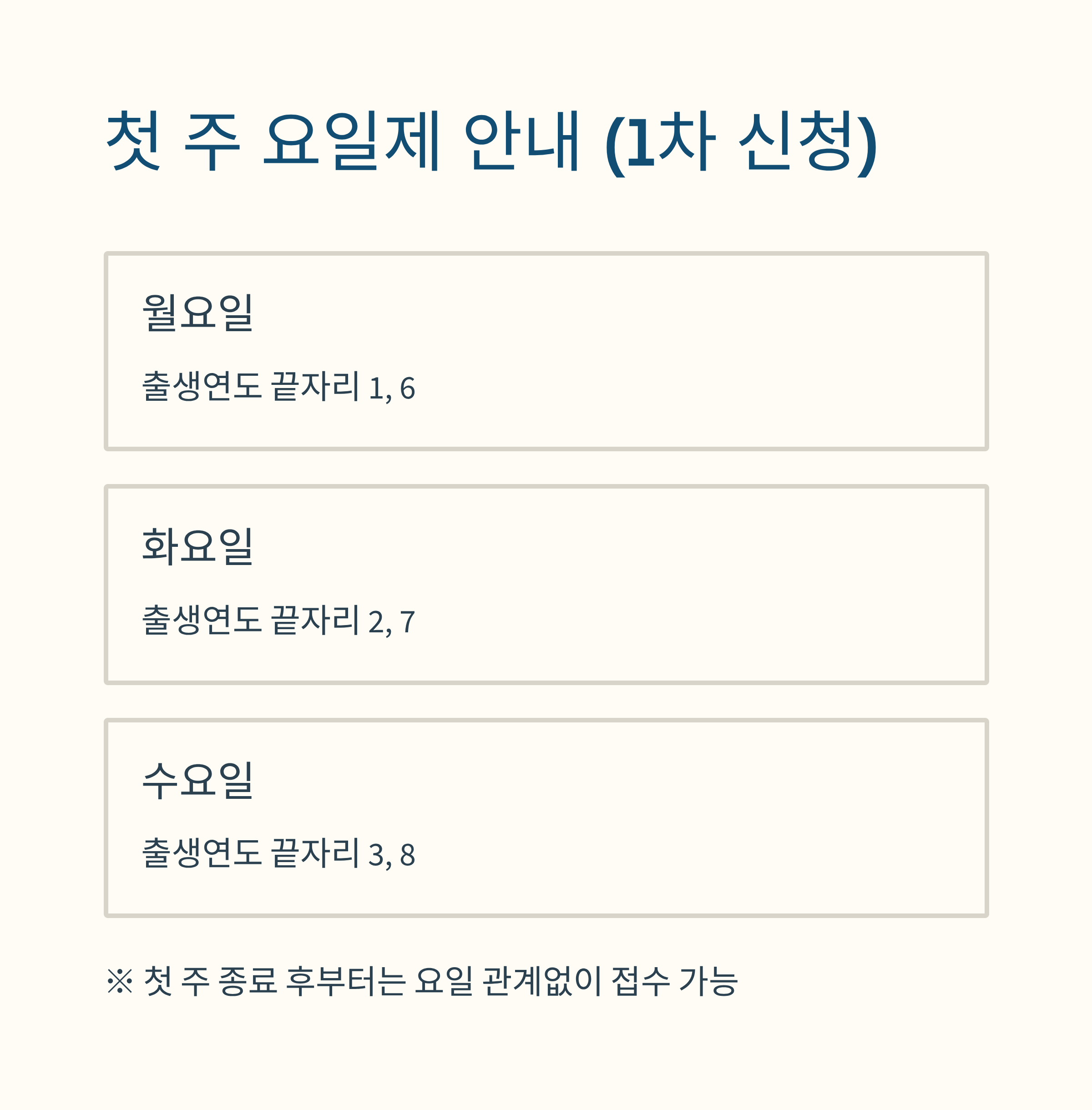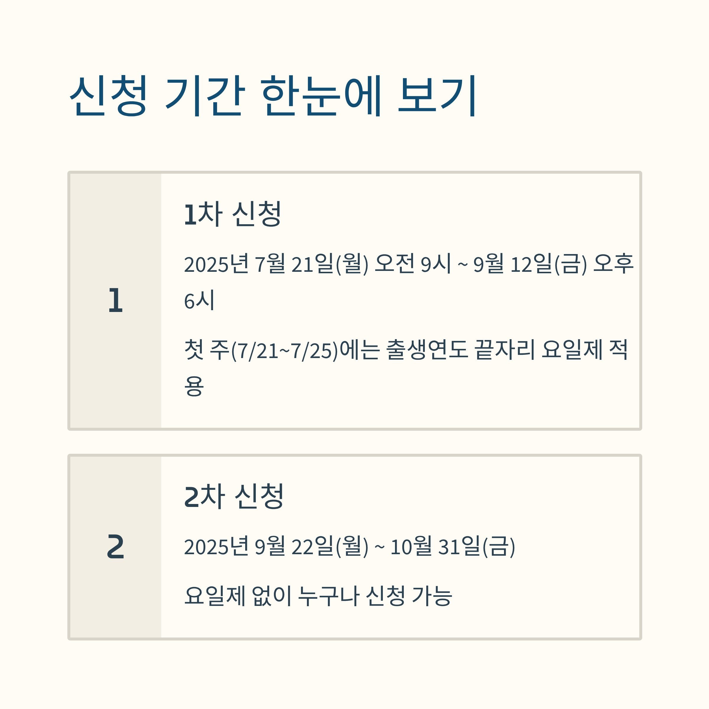 | 1차 신청 | 2025.7.21~9.12 | 첫 주는 요일제 적용 |
