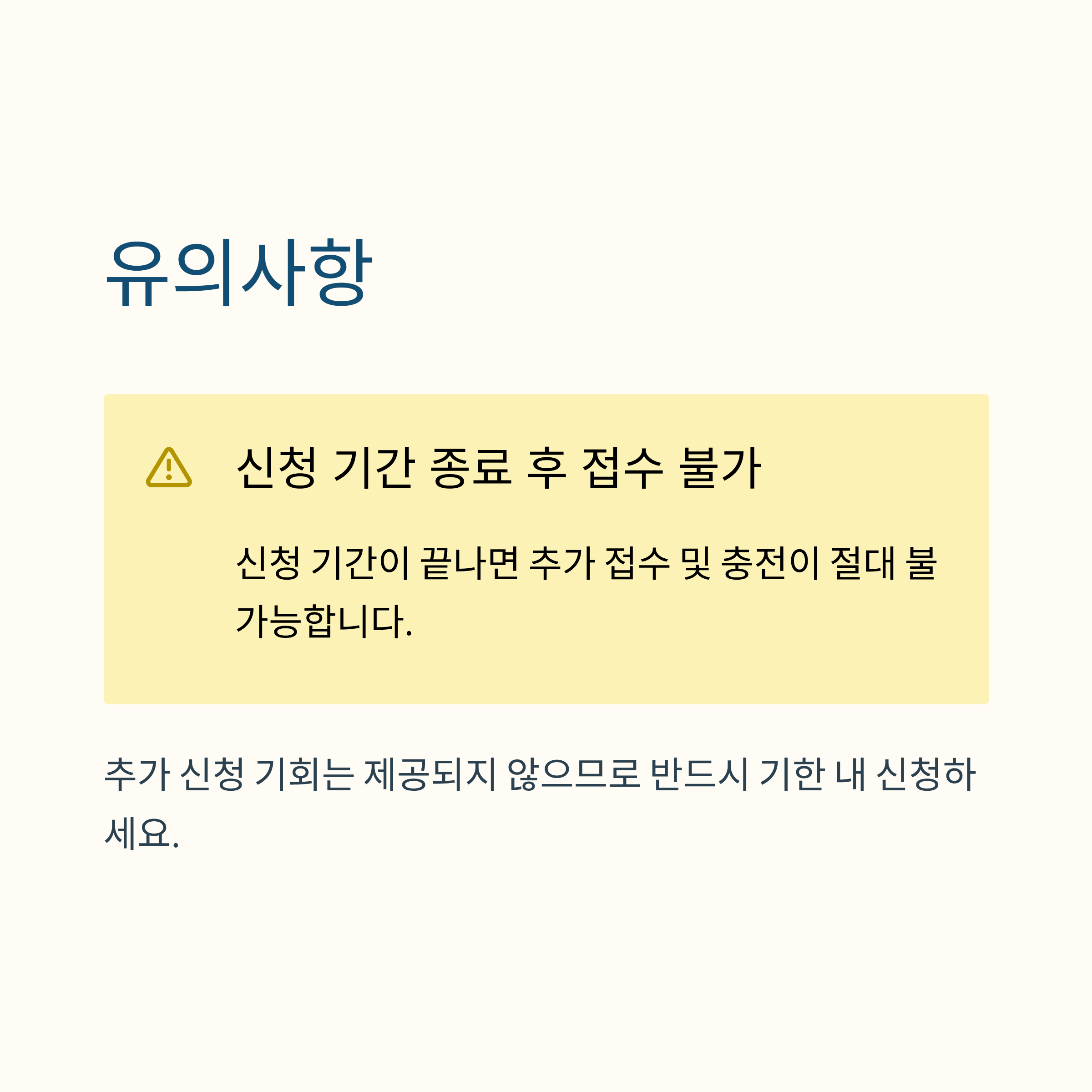 - 추가 신청 기회는 제공되지 않으므로 반드시 기한 내 신청 필요