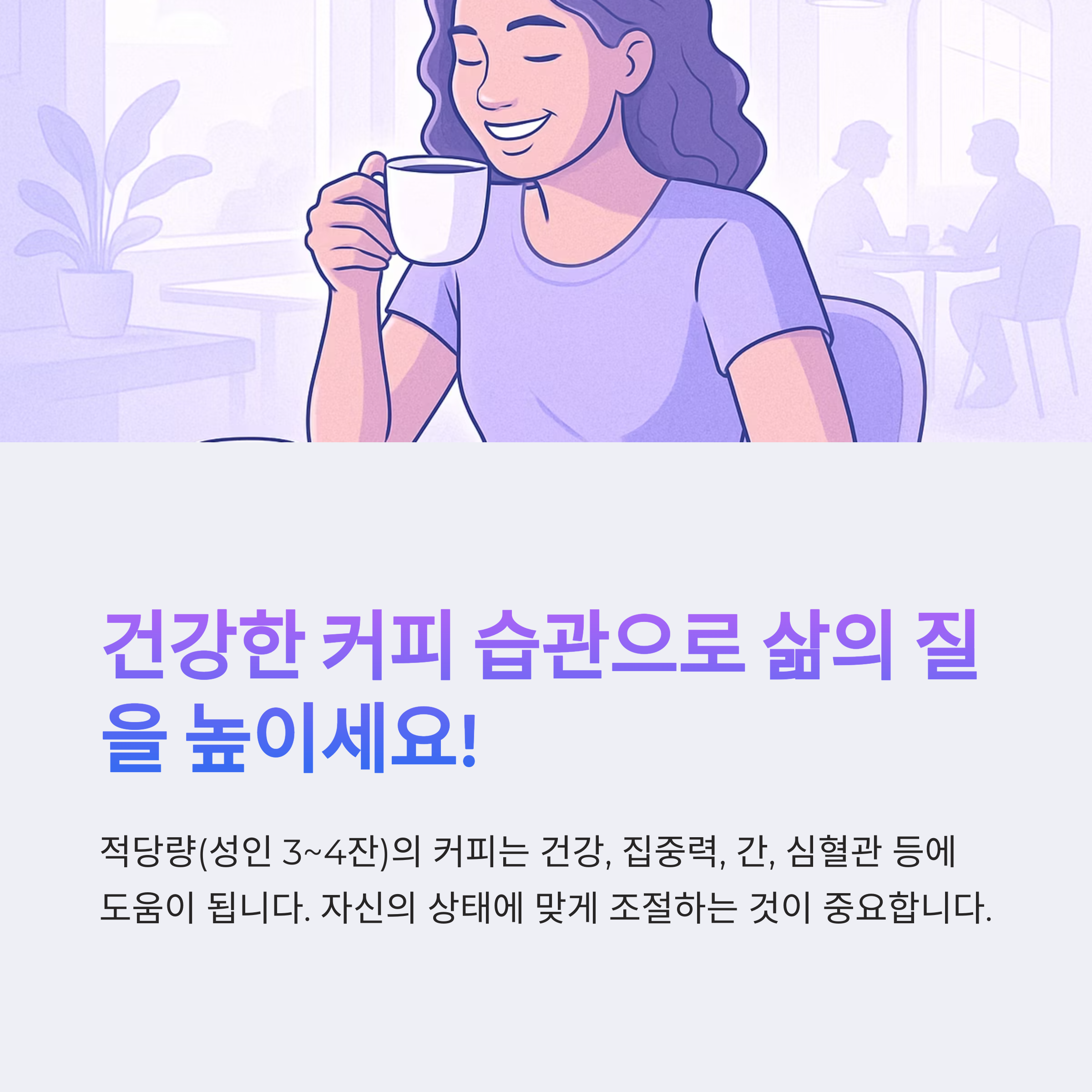 - 커피는 적당량(성인 3~4잔) 마실 경우 건강·집중력·간·심혈관 등에 도움이 됩니다.