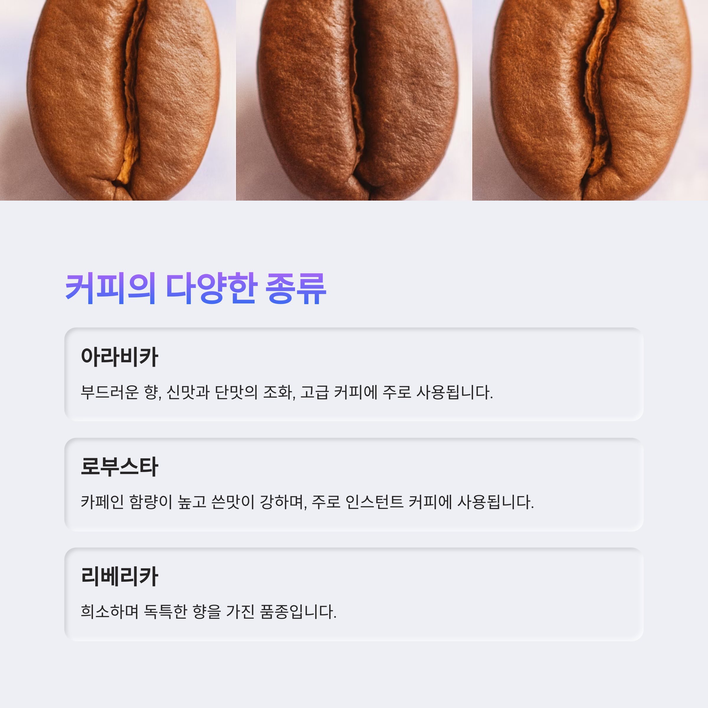 - 로부스타: 카페인 함량 높고 쓴맛 강함, 인스턴트 사용